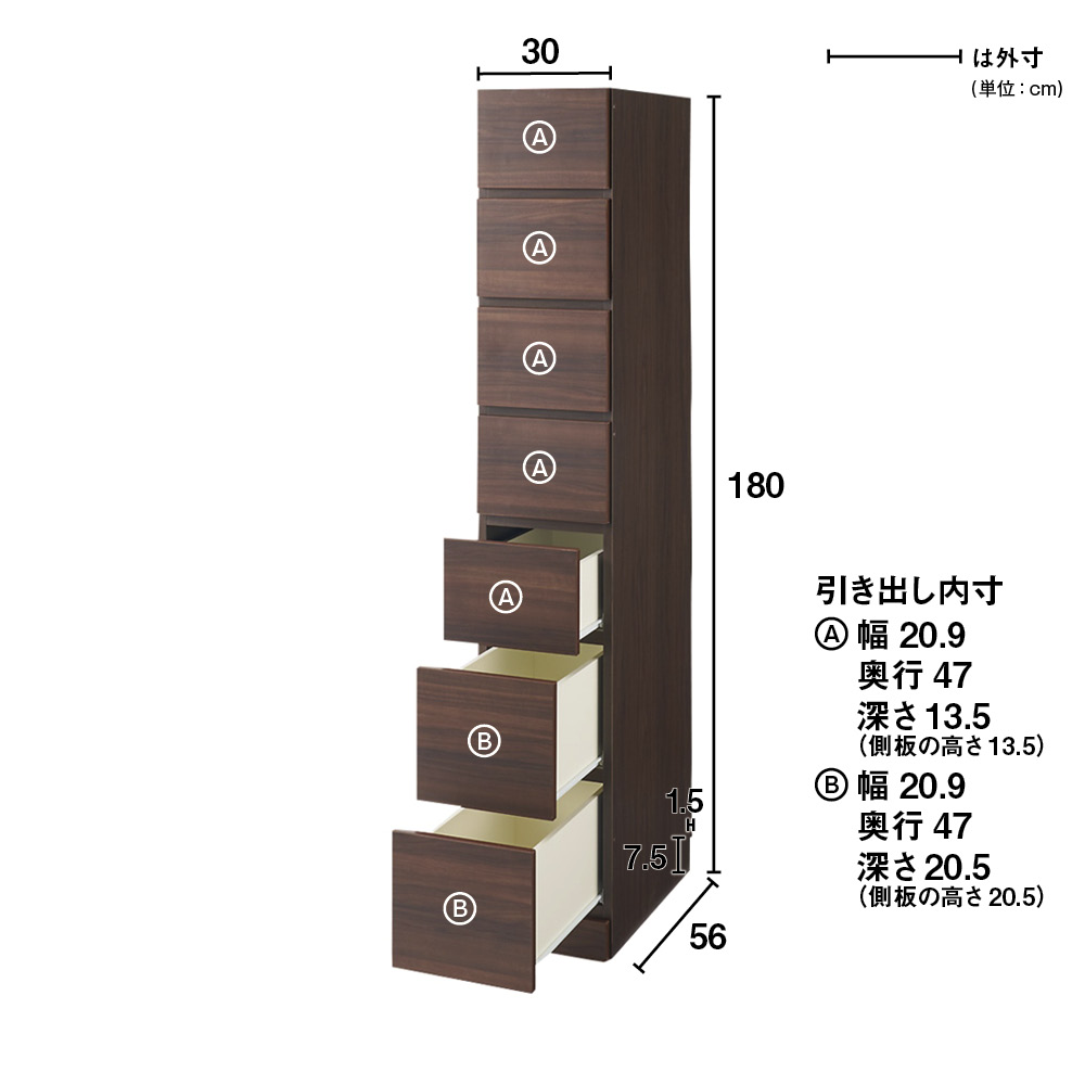 梁にぴったり、まるで備え付けのよう!これぞ壁面収納ワードローブの決定版!お部屋の複雑な天井構造にもしっかり対応してくれる一押しの機能派商品!天井の大きい梁、重なり合う梁、いろいろな梁下など、その構造で壁面収納を諦めざるを得なかった、そんな悩みを一気に解決する商品です。サイズやタイプの違う40種類から自由な組み合わせが可能なしたい衣類収納空間を実現する一押しの壁面収納ワードローブシリーズ!商品のポイントは3つあります(1)本体高さ140cmと180cmの2タイプあることにより対応する天井または梁下高さが168〜272cmとなり、対応範囲がとても広くなっております。(2)幅30cm、40cmの幅の狭い本体、上置きをご用意することで、縦方向の大きな梁下でも突っ張れるように考慮しております。(3)上置きの突っ張り板を隠して見た目をスッキリさせながら、(本体よりも)奥行の浅い梁下でも突っ張れるように、突っ張り板の奥行も浅くしつつ、後方に位置させております。上記のポイントから、大きな梁、高さはあるけど奥行は浅い梁、縦方向の大きな梁といった様々なタイプの梁下でも設置できるようになっている優れもの商品です。1.シリーズバリエーション40種類以上●幅は30cm、40cm、60cm、80cmの4サイズから。●奥行は56cmで全シリーズ共通です。●本体商品の高さは140cmと180cmの2タイプとなっております。●型タイプはハンガータイプ (※140cmはハンガーバー1本、高さ180cmはハンガーバー2本)ハンガー&引き出しタイプ棚タイプタワーチェストタイプからお選びいただけます。●商品カラーは清潔感のある優しい艶色のホワイト、自然の温もりを感じる横木目調のナチュラル、上質空間を演出する大人な横木目調のダークブラウンの3色からお選びいただけます。2.うれしい機能が充実な、こだわりの設計構造!●扉はプッシュ式扉になっているので、手で押すだけでスムーズに開閉できる仕様になっております。●引き出しが付いている商品はスライドレール仕様となっており、開け閉めがとてもラクラクです。●上置き商品は突っ張り式なので、商品と天井をしっかり支えることができとても安心です。●本体は床と接する部分の板を厚めにしており、床からのほこり侵入を開閉時も抑えることができます。●最下段の引き出しは、ラグなどを手前に敷いていても引っかからずにスムーズに開閉できます。●本体は幅木対応(1.5cm×7.5cm)となっておりますので、壁にピッタリの設置が出来ます。●転倒防止バンドもついておりますので、上置き購入がなく本体のみても安心してお使いいただけます。●こだわりのシートをぜいたくに使用しており、高級感のある商品に仕上がっております。●ホワイトは優しい艶感のある清潔感溢れる汚れに強いエクセルイーゴスシートを使用。●ナチュラルとダークブラウンには横木目が美しく映え、摩擦や傷にも強いオレフィンシートを使用しております。●飽きの来ないシンプルを追求した洗練デザインなので、どんなお部屋にもマッチし、末永くお使いいただけます。3.商品補足説明●本体幅30cmと幅40cmの扉タイプ商品のご購入を検討されている方は、扉の右開き、左開きを選択してご購入していただけます。(※タワーチェストタイプは除く)●もちろん梁のない壁面の天井でもばっちり設置可能ですので、マンションでも一戸建てにお住まいのお客様でもご使用いただけます。●上置きご希望の方は、本体の幅サイズに合わせて、高さ26〜90cmでオーダーできます。本体との組み合わせで天井【梁下】対応は168cm〜272cmとなります。
