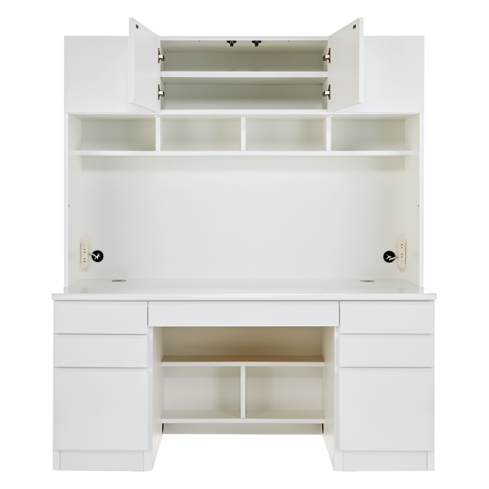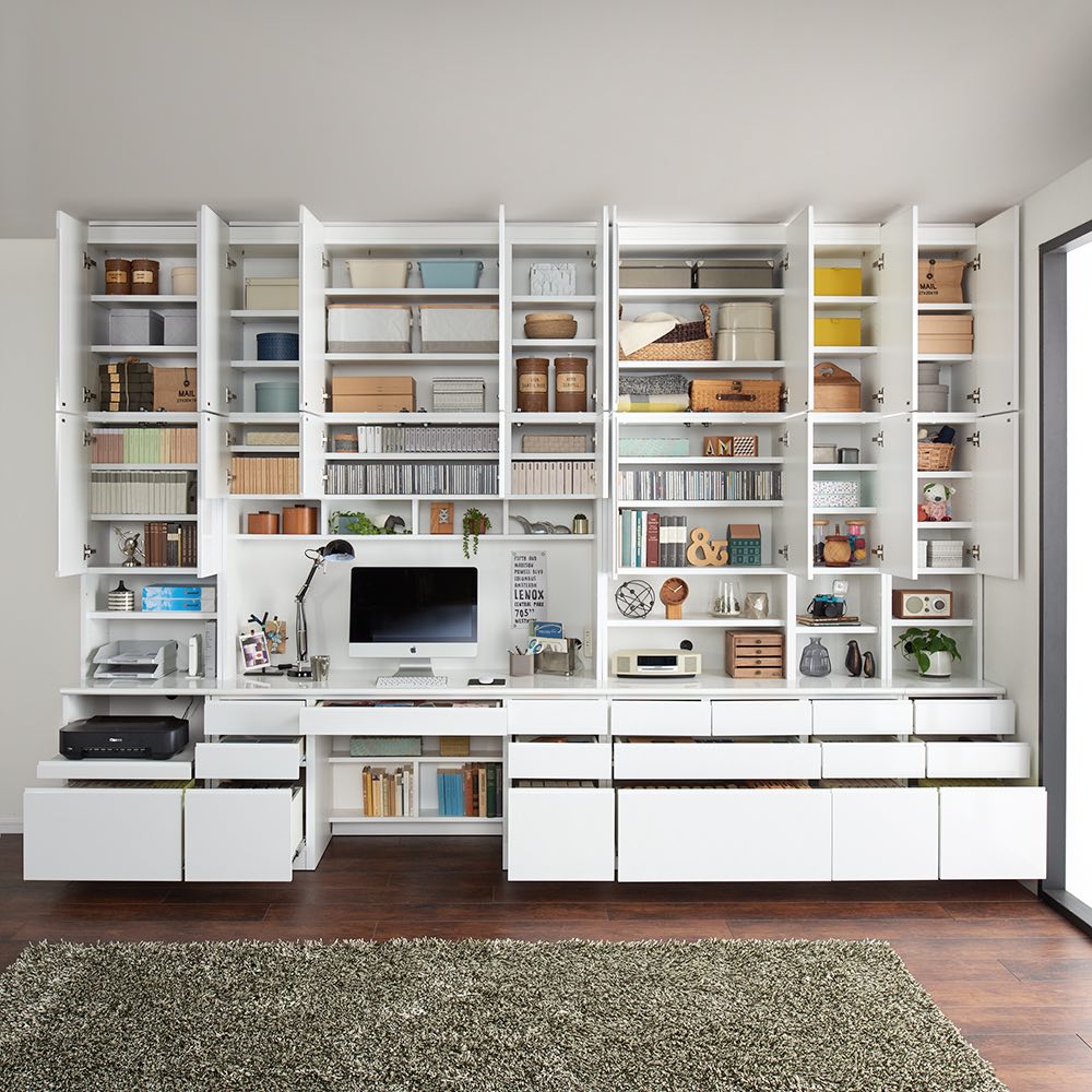 壁一面にたっぷり収納ができる本格派デスク。PC周りで散らかりがちなコード類も、タテヨコを自在に通してすっきり配線ができます。お気に入りのスタイルを選んで快適なワークスペースを実現してみませんか。壁一面がまるでリフォームしたようなワークスペースに大変身します●おうちの空いているスペースを本格的なオフィス空間にできる壁面収納シリーズです。●仕事用デスク、学習デスク、パソコンデスク、様々な目的に使用できます。●並べるとデスクと奥行がぴったり一致する収納棚やプリンター収納もご用意。収納バリエーションは4タイプ!「デスク」「扉+オープン棚」「扉+引出し」「プリンター収納付き」から自由に組み合わせられます●デスクは幅89cmの「棚付き」、幅116.5cmの「左引出し」「右引出し」、幅155cm「両引出し」の4タイプから選べます。●デスク天板には2口コンセント付きでPCやスマホの充電に便利です。(幅155cmのみ4口コンセント付きです)●扉・オープンタイプは上下が扉収納、真ん中がオープン棚なので書類やファイル、雑貨など大きいものを棚板の高さを変えながら効率よく収納できます。●扉・引出しタイプは上が扉、真ん中がオープン棚、下が引き出しなので小物から大物まで細かく分類して収納することができます。●引出しの下段はフルスライドレールが付いているので少ない力でラクに開閉できます。A4ファイルが収納できるサイズです。●プリンター収納付きは下台のスライドテーブルにプリンターがしまえるタイプです。必要な時だけ手前に引き出せるので普段が中にしまってすっきり見せることができます。コード類は本体の中を通せるのでごちゃつかずにスッキリ配線できます●全ての収納にコード穴が付いているので、配線を表に見せずに内部を通して両端のコンセントにつなぐことができます。●本体を設置した後から配線ができるので、PCモニターやプリンターを買い足した時でも本体を動かさずに簡単に配線ができます。●各収納のオープン棚には背板へ配線を通す穴が付いているので、スピーカーやオーディオ機器を設置しても前からコードが見えません。上置きは高さ1cm単位でオーダーができるので天井ぴったりまで収納場所がつくれます●上置きは扉付きの収納となっており、高さを1cm単位でオーダーできます。●天井対応高さは208cm〜272cmまで対応しております。●キッチンやダイニングの低い天井でも、リビングの高い天井でも無駄なスペースを残さずぴったり設置できるので、まるで造り付けのようなデザインになります。●「設置場所の高さ」−「180cm」−「2cm」で計算してご注文をしてください。※−2cmは天井に金具を突っ張るために必要なスペースになります。●上置きの中にある可動棚は本体高さ40cm以上で付属します。高さを調整しながら中を2段使って収納ができます。●安心の「日本製」とお届けしてすぐ使える「完成品」にこだわりぬいた大川の家具職人がつくるリビング収納をぜひともお楽しみください。
