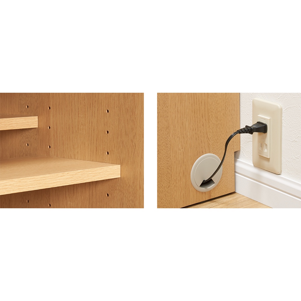 (左)高さ調節できる棚板。収納物に合わせて3cm間隔で高さ調節可能。(右)壁付けしやすい。幅木カットと配線穴で、壁にぴったり設置。