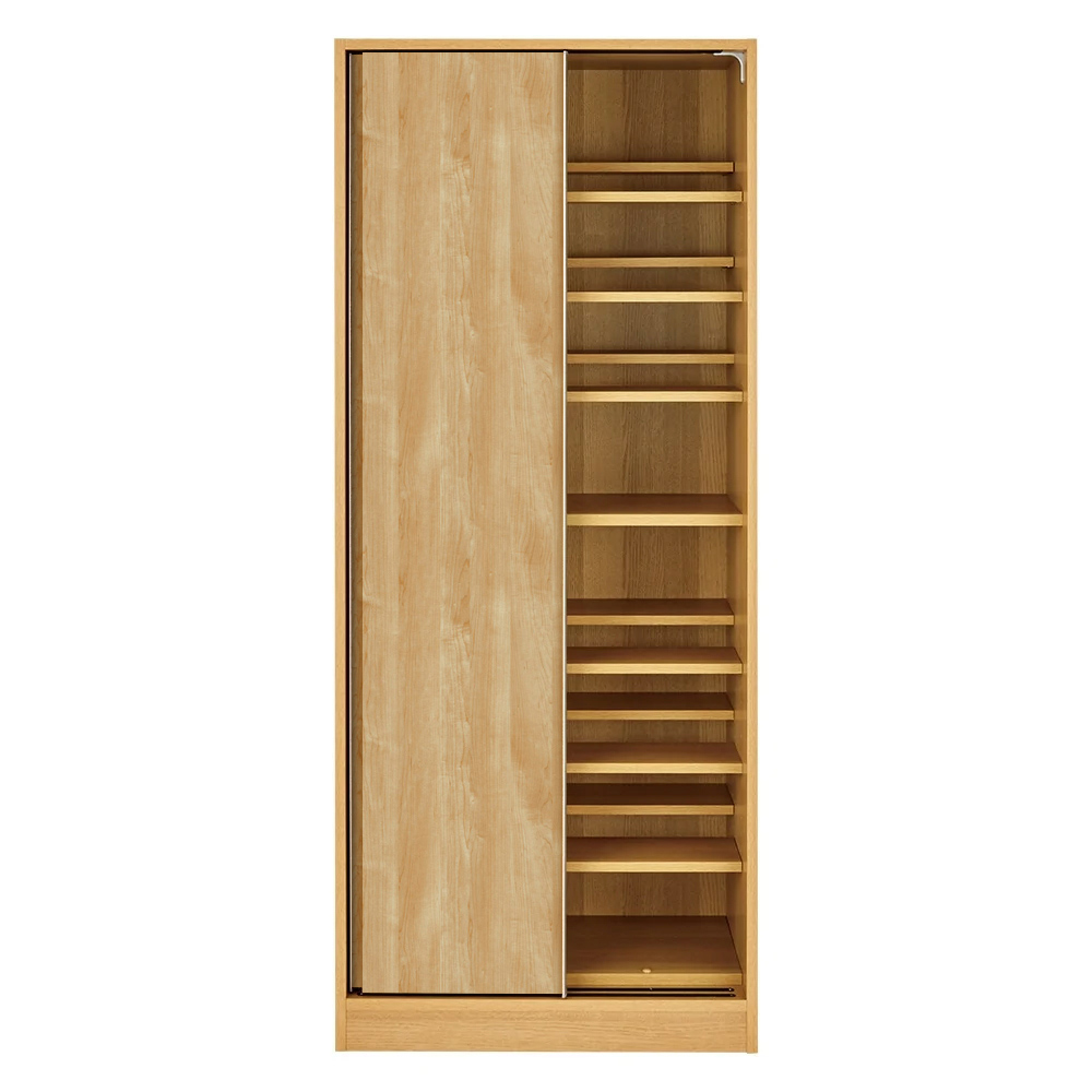 開閉に場所を取らない引き戸ですっきり、省スペースでも大量収納をかなえる壁面収納ユニット家具。棚・テレビ台・デスクの豊富なアイテムから組み合わせを選べます。天井ぴったりに高さオーダーできる別売りの上置きをセットすれば、さらに充実の収納空間が実現します。狭い部屋にも充実の収納を叶える、引き戸式の大量収納!開け閉めに場所を取らない引き戸式なので、手前にソファーや荷物があっても、どかすことなく省スペースで物を出し入れすることができます。ミラー扉タイプを使えば、お部屋を広く演出することも。【POINT 1】スッキリ片付くためのこだわりの工夫がいっぱい●引き戸はローラー付き&レール付きで開け閉めらくらく軽い力でスムーズに扉が開閉できるよう、ローラーとレールが付いています。アルミの取っ手は手を掛けられる範囲が広いのが◎いい意味で目立ちにくいので扉を閉めた状態の見た目も美しいです。●スッキリまとめて配線できるコード穴各アイテム同士は配線穴を通して内部で配線ができ、側面から外部のコンセント電源に繋げられます。アイテムを設置した後でも、配線のセッティングや変更も可能です。テレビ台やオープン引出しタイプには、棚の上下や背面へ繋がるコード穴も装備しています。テレビやデッキ、パソコンやプリンターはもちろん、掃除機を充電しながらしまうこともできます。●棚板は3cm間隔で調整可能収納物に合わせて細かく調整できるよう、棚板の間隔は3cmピッチ。もったいない空間が生まれない、効率収納&大量収納を叶えます。天板の全面が柔らかなアーチ曲線のため、高級感ある仕上がりになっています。【POINT 2】収納庫やテレビ台、上置き収納など商品ラインナップが豊富!タイプ・サイズ・カラーの組み合わせで、81種類と沢山のアイテム数をご用意しました。設置する部屋の雰囲気や収納したいものに合わせてお選びいただけます。●各商品アイテムの紹介・扉タイプ…フラット扉を開けると内部は収納棚になっている一番定番の型になります。 日用品やストック用品、本やCD・DVD、子どものおもちゃやペット用品まで何でもスッキリ収納。・ミラー扉タイプ…扉がミラーになっているのでお部屋を広く美しく演出します。 お出かけ前のちょっとした姿見の鏡としても便利です。収納内部は扉タイプと同じです。・段違い棚タイプ…棚板が前後で分割しているので、無駄なスペースなく効率的に収納できます。 物を前後にしまっても後ろのものが見やすかったり、前側の棚板を外せば長物も入ります。・PCデスク…スライドテーブルを引き出すとキーボードやノートパソコンが使えるパソコンデスクです。 スライドテーブルにはノートPCが収納できます。コンセントが2口付いています。・テレビ台…一般的な高さ約50cmにテレビが設置できるタイプです。コンセントは4口付き テレビ上の空間は無駄にならないよう置けるTVサイズを考慮して収納をつけました。・上置き…各収納庫とテレビ台の上に設置できる、天井までの空間を利用した収納です。 まるで備え付け収納のような、設置したい場所にぴったりを実現するオーダー家具です。 上置きは、高さを26〜90cmの間で1cm単位でオーダーすることができます。 ※対応できる天井高さは、208cm〜272cmまでになるのでご注意ください。○選べるおしゃれな3色のカラー展開・(ア)ホワイトは、お部屋を選ばない透明感のある爽やかさが魅力です。 シンプルでモダンなリビングにぴったりですが、清潔感あるキッチンインテリアにもお勧め。・(イ)ナチュラルは、木目柄が印象的な、明るさと優しさを持ち合わせた色味になります。 人気の北欧風スタイルやナチュラルモダンなインテリアと空間にマッチします。・(ウ)ダークブラウンは、落ち着いた天然木調が印象的。シックなインテリアによく合います。 プライベートルームや書斎で書棚使いとしても重厚感がありおすすめです。