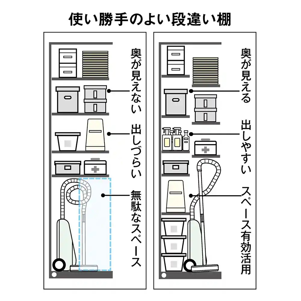 長尺の掃除用具や季節家電の収納に便利な段違い棚タイプ。前・後棚の使い分けでスペースをアレンジ。