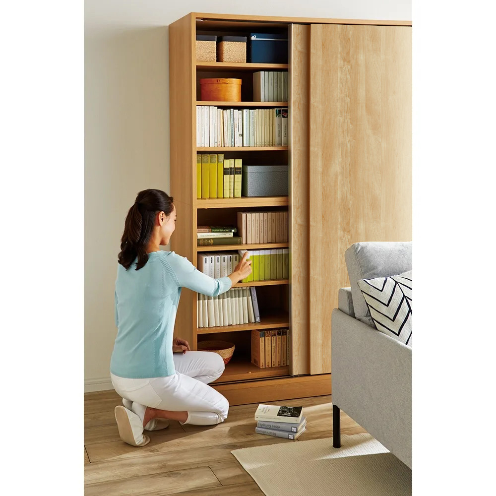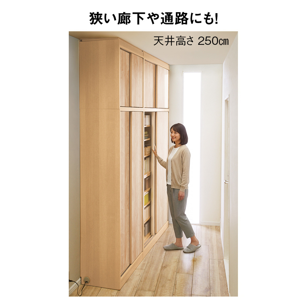 開閉に場所を取らない引き戸ですっきり、省スペースでも大量収納をかなえる壁面収納ユニット家具。棚・テレビ台・デスクの豊富なアイテムから組み合わせを選べます。天井ぴったりに高さオーダーできる別売りの上置きをセットすれば、さらに充実の収納空間が実現します。狭い部屋にも充実の収納を叶える、引き戸式の大量収納!開け閉めに場所を取らない引き戸式なので、手前にソファーや荷物があっても、どかすことなく省スペースで物を出し入れすることができます。ミラー扉タイプを使えば、お部屋を広く演出することも。【POINT 1】スッキリ片付くためのこだわりの工夫がいっぱい●引き戸はローラー付き&レール付きで開け閉めらくらく軽い力でスムーズに扉が開閉できるよう、ローラーとレールが付いています。アルミの取っ手は手を掛けられる範囲が広いのが◎いい意味で目立ちにくいので扉を閉めた状態の見た目も美しいです。●スッキリまとめて配線できるコード穴各アイテム同士は配線穴を通して内部で配線ができ、側面から外部のコンセント電源に繋げられます。アイテムを設置した後でも、配線のセッティングや変更も可能です。テレビ台やオープン引出しタイプには、棚の上下や背面へ繋がるコード穴も装備しています。テレビやデッキ、パソコンやプリンターはもちろん、掃除機を充電しながらしまうこともできます。●棚板は3cm間隔で調整可能収納物に合わせて細かく調整できるよう、棚板の間隔は3cmピッチ。もったいない空間が生まれない、効率収納&大量収納を叶えます。天板の全面が柔らかなアーチ曲線のため、高級感ある仕上がりになっています。【POINT 2】収納庫やテレビ台、上置き収納など商品ラインナップが豊富!タイプ・サイズ・カラーの組み合わせで、81種類と沢山のアイテム数をご用意しました。設置する部屋の雰囲気や収納したいものに合わせてお選びいただけます。●各商品アイテムの紹介・扉タイプ…フラット扉を開けると内部は収納棚になっている一番定番の型になります。 日用品やストック用品、本やCD・DVD、子どものおもちゃやペット用品まで何でもスッキリ収納。・ミラー扉タイプ…扉がミラーになっているのでお部屋を広く美しく演出します。 お出かけ前のちょっとした姿見の鏡としても便利です。収納内部は扉タイプと同じです。・段違い棚タイプ…棚板が前後で分割しているので、無駄なスペースなく効率的に収納できます。 物を前後にしまっても後ろのものが見やすかったり、前側の棚板を外せば長物も入ります。・PCデスク…スライドテーブルを引き出すとキーボードやノートパソコンが使えるパソコンデスクです。 スライドテーブルにはノートPCが収納できます。コンセントが2口付いています。・テレビ台…一般的な高さ約50cmにテレビが設置できるタイプです。コンセントは4口付き テレビ上の空間は無駄にならないよう置けるTVサイズを考慮して収納をつけました。・上置き…各収納庫とテレビ台の上に設置できる、天井までの空間を利用した収納です。 まるで備え付け収納のような、設置したい場所にぴったりを実現するオーダー家具です。 上置きは、高さを26〜90cmの間で1cm単位でオーダーすることができます。 ※対応できる天井高さは、208cm〜272cmまでになるのでご注意ください。○選べるおしゃれな3色のカラー展開・(ア)ホワイトは、お部屋を選ばない透明感のある爽やかさが魅力です。 シンプルでモダンなリビングにぴったりですが、清潔感あるキッチンインテリアにもお勧め。・(イ)ナチュラルは、木目柄が印象的な、明るさと優しさを持ち合わせた色味になります。 人気の北欧風スタイルやナチュラルモダンなインテリアと空間にマッチします。・(ウ)ダークブラウンは、落ち着いた天然木調が印象的。シックなインテリアによく合います。 プライベートルームや書斎で書棚使いとしても重厚感がありおすすめです。
