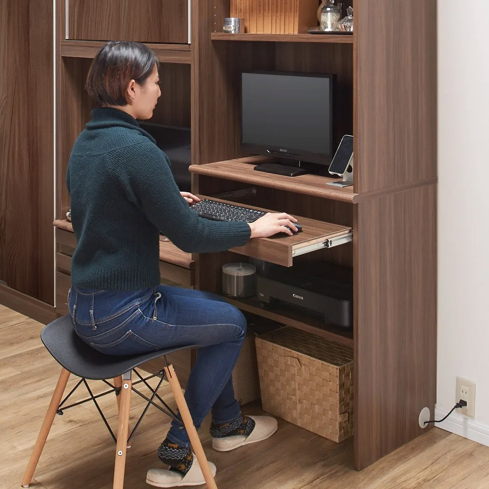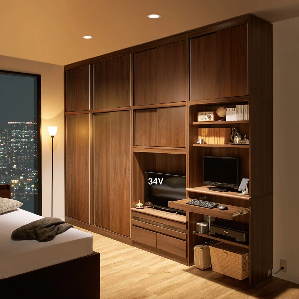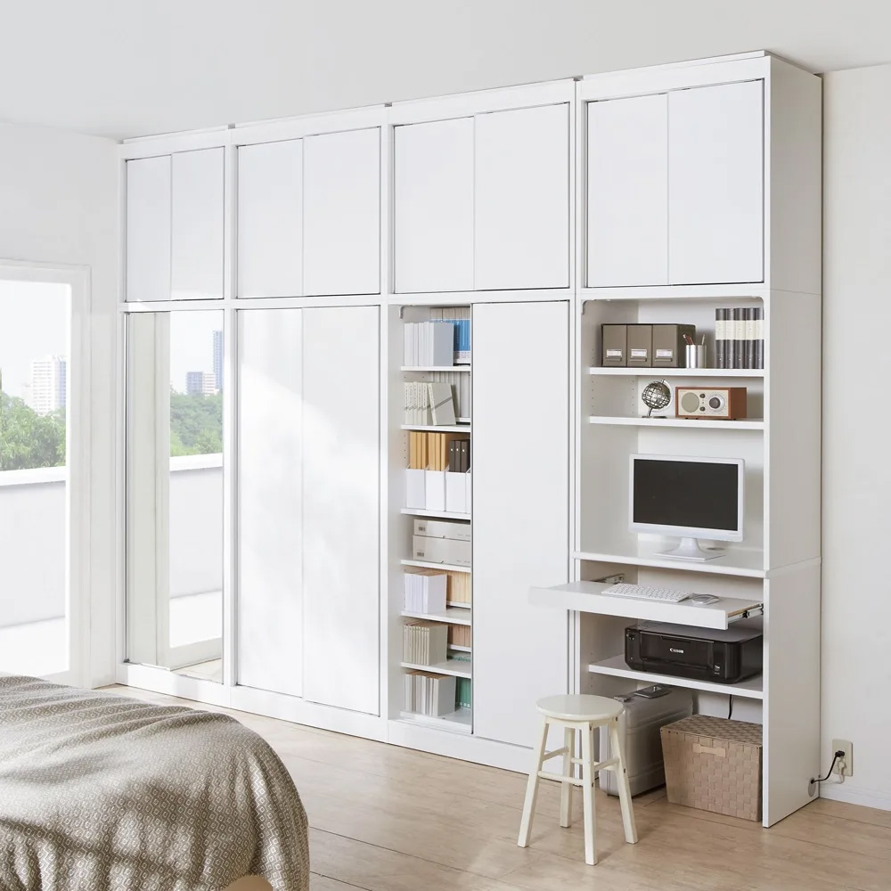 開閉に場所を取らない引き戸ですっきり、省スペースでも大量収納をかなえる壁面収納ユニット家具。棚・テレビ台・デスクの豊富なアイテムから組み合わせを選べます。天井ぴったりに高さオーダーできる別売りの上置きをセットすれば、さらに充実の収納空間が実現します。パソコンデスクを組み込んで、リビングルーム・ベッドルームを効率的なワーキングスペースに。メリットいっぱい!引き戸の壁面収納シリーズ扉にキズや汚れに強い表面材を使用した引き戸壁面収納シリーズ。巾木カット(高さ7.5cm 奥行1.5cm)加工済で、壁にピッタリ設置できます。機能充実パソコンデスクディスプレイ台(中天板)は化粧板(メラミン化粧板ポストフォーム加工)により、キズや汚れに強くきれいな仕上がりになっております。ディスプレイ台右奥には2口コンセント1500Wブレーカー付きを1個備えており、PCやディスプレイの電源を供給することが可能です。配線穴も充実しています。設置してからでも機器の配線が可能です。キーボードやノートPCの収納が可能なスライドテーブルがあります。狭い部屋にも充実の収納を叶える、引き戸式の大量収納!開け閉めに場所を取らない引き戸式なので、手前にソファーや荷物があっても、どかすことなく省スペースで物を出し入れすることができます。ミラー扉タイプを使えば、お部屋を広く演出することも。【POINT 1】スッキリ片付くためのこだわりの工夫がいっぱい●引き戸はローラー付き&レール付きで開け閉めらくらく軽い力でスムーズに扉が開閉できるよう、ローラーとレールが付いています。アルミの取っ手は手を掛けられる範囲が広いのが◎いい意味で目立ちにくいので扉を閉めた状態の見た目も美しいです。●スッキリまとめて配線できるコード穴各アイテム同士は配線穴を通して内部で配線ができ、側面から外部のコンセント電源に繋げられます。アイテムを設置した後でも、配線のセッティングや変更も可能です。テレビ台やオープン引出しタイプには、棚の上下や背面へ繋がるコード穴も装備しています。テレビやデッキ、パソコンやプリンターはもちろん、掃除機を充電しながらしまうこともできます。●棚板は3cm間隔で調整可能収納物に合わせて細かく調整できるよう、棚板の間隔は3cmピッチ。もったいない空間が生まれない、効率収納&大量収納を叶えます。天板の全面が柔らかなアーチ曲線のため、高級感ある仕上がりになっています。【POINT 2】収納庫やテレビ台、上置き収納など商品ラインナップが豊富!タイプ・サイズ・カラーの組み合わせで、81種類と沢山のアイテム数をご用意しました。設置する部屋の雰囲気や収納したいものに合わせてお選びいただけます。●各商品アイテムの紹介・扉タイプ…フラット扉を開けると内部は収納棚になっている一番定番の型になります。・ミラー扉タイプ…扉がミラーになっているのでお部屋を広く美しく演出します。・段違い棚タイプ…棚板が前後で分割しているので、無駄なスペースなく効率的に収納できます。・PCデスク…スライドテーブルを引き出すとキーボードやノートパソコンが使えるパソコンデスクです。 スライドテーブルにはノートPCが収納できます。コンセントが2口付いています。・テレビ台…一般的な高さ約50cmにテレビが設置できるタイプです。コンセントは4口付き テレビ上の空間は無駄にならないよう置けるTVサイズを考慮して収納をつけました。・上置き…各収納庫とテレビ台の上に設置できる、天井までの空間を利用した収納です。 まるで備え付け収納のような、設置したい場所にぴったりを実現するオーダー家具です。 上置きは、高さを26〜90cmの間で1cm単位でオーダーすることができます。 ※対応できる天井高さは、208cm〜272cmまでになるのでご注意ください。○選べるおしゃれな3色のカラー展開・(ア)ホワイトは、お部屋を選ばない透明感のある爽やかさが魅力です。・(イ)ナチュラルは、木目柄が印象的な、明るさと優しさを持ち合わせた色味になります。・(ウ)ダークブラウンは、落ち着いた天然木調が印象的。シックなインテリアによく合います。