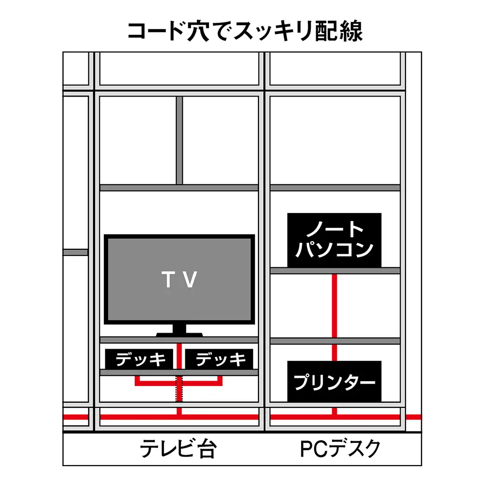 配線は側面コード穴から内部を通せるので、設置後のセッティングや並び変えも簡単・手軽に行えます。