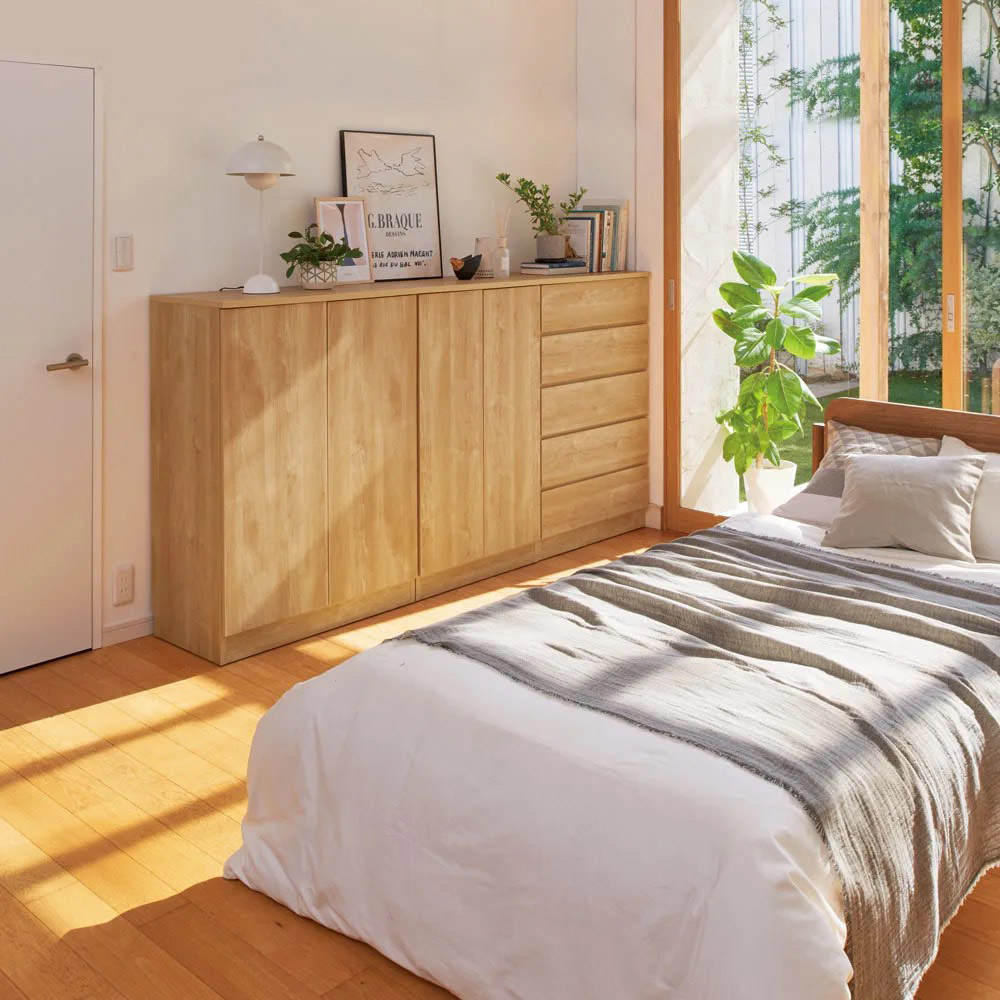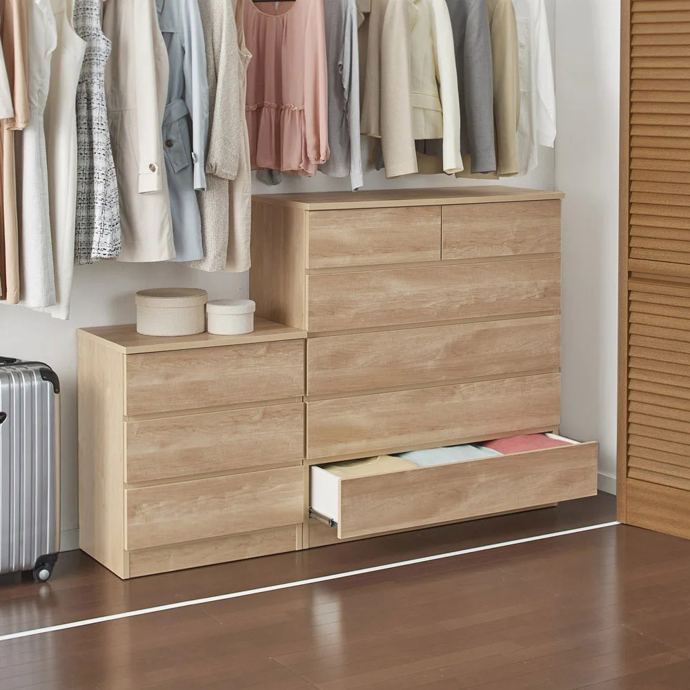 使用イメージ(ウ)ナチュラル チェスト(写真右)と、シリーズ品のキャビネットタイプ(写真左・中央)を並べても高さが揃うので統一感がありすっきり。 ※「ぴったりサイズが見つかる」シリーズには、別売りの「プッシュ扉キャビネットシリーズ」がございます。