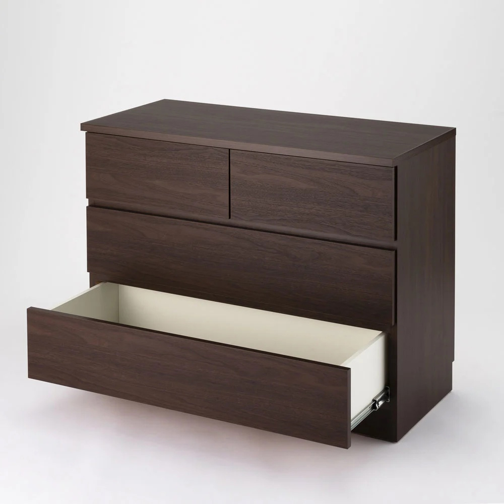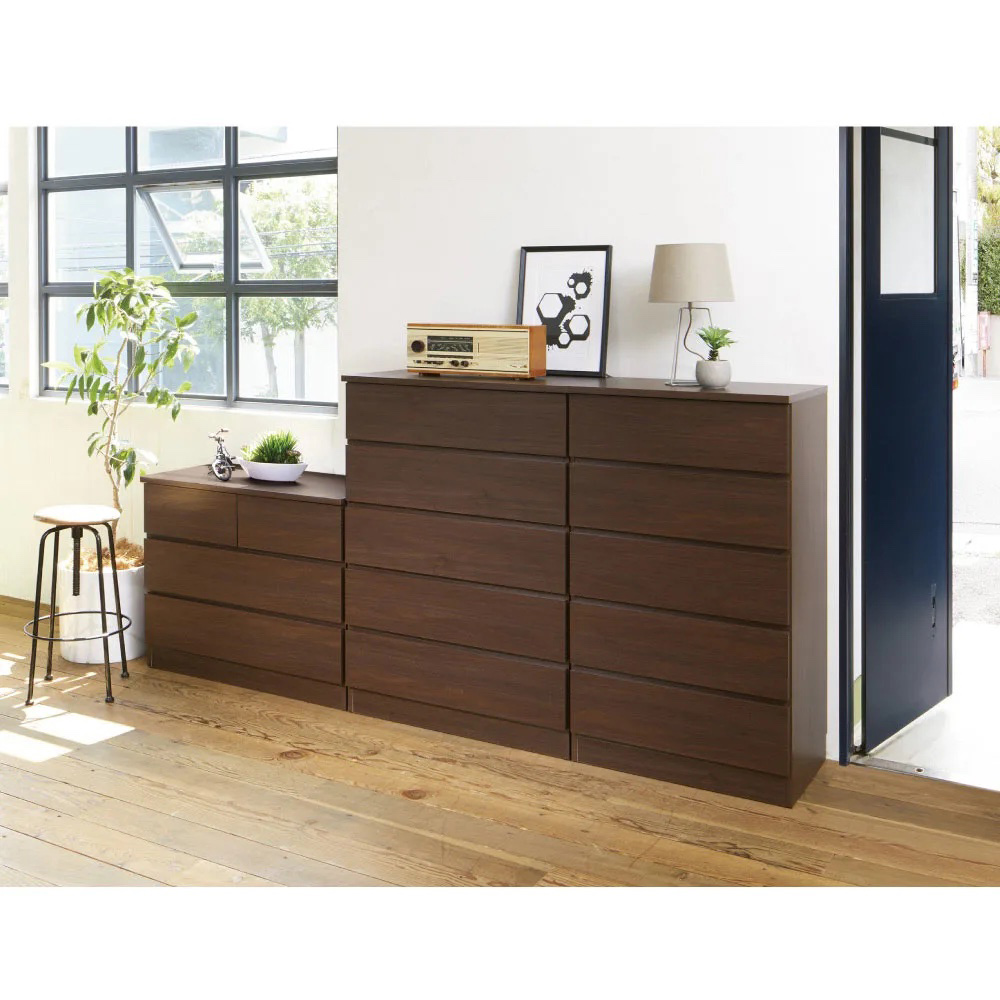 豊富なサイズ(39種類)から選ぶだけ。サイズオーダーしなくても、造り付けのような収納空間が手軽にできるチェストシリーズ。「置き場所にぴったり!」が叶います。ロータイプ でも収納量がある幅85cm●幅85cm、3段高さ69.5cmで圧迫感を与えない高さです。●リビングやクローゼットの中でも使いやすいサイズです。●寝室ではシーツやカバーなど、リネン類の収納に便利です。引き出しはフルスライドレール、使いやすい機能的な作り●引き出しは全段フルスライドレール付き。●奥までフルに収納してもスムーズに引き出せ、出し入れがラクにできます。●背面は幅木カット済み。壁にすき間を作らずぴったり設置できます。サイズは全部で39種類。置き場所や用途に応じて選べます●幅は40cmから100cmまで5cm刻みで13サイズ、高さは3段、4段、5段の3サイズ、全部で39種類を揃えました。●色は、ブラウン、ホワイト、ナチュラルの3色から選べます。●リビング、寝室、クローゼットの中など、単品でも、組み合わせても、置き場所や用途にぴったり合った、ムダのない収納スペースが完成します。●国内工場で丁寧に作られた国産品です。●完成品でお届けするので、届いたその日からすぐに使えます。シリーズ商品のご案内「ぴったりサイズが見つかる」シリーズには、扉タイプのキャビネットもございます。用途や収納物に合わせ、組み合わせて統一感のあるお部屋づくりができます。