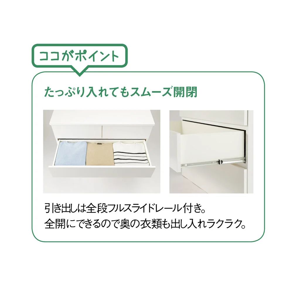 豊富なサイズ(39種類)から選ぶだけ。サイズオーダーしなくても、造り付けのような収納空間が手軽にできるチェストシリーズ。「置き場所にぴったり!」が叶います。ロータイプ でも収納量がある幅100cm●幅100cm、3段高さ69.5cmで圧迫感を与えない高さです。●テレビ台としても利用できます。●リビングやクローゼットの中でも使いやすいサイズです。●子ども部屋の収納にもおすすめです。●最上段は小引き出し2杯で、小物も収納しやすい仕様です。引き出しはフルスライドレール、使いやすい機能的な作り●引き出しは全段フルスライドレール付き。●奥までフルに収納してもスムーズに引き出せ、出し入れがラクにできます。●背面は幅木カット済み。壁にすき間を作らずぴったり設置できます。サイズは全部で39種類。置き場所や用途に応じて選べます●幅は40cmから100cmまで5cm刻みで13サイズ、高さは3段、4段、5段の3サイズ、全部で39種類を揃えました。●色は、ブラウン、ホワイト、ナチュラルの3色から選べます。●リビング、寝室、クローゼットの中など、単品でも、組み合わせても、置き場所や用途にぴったり合った、ムダのない収納スペースが完成します。●国内工場で丁寧に作られた国産品です。●完成品でお届けするので、届いたその日からすぐに使えます。シリーズ商品のご案内「ぴったりサイズが見つかる」シリーズには、扉タイプのキャビネットもございます。用途や収納物に合わせ、組み合わせて統一感のあるお部屋づくりができます。
