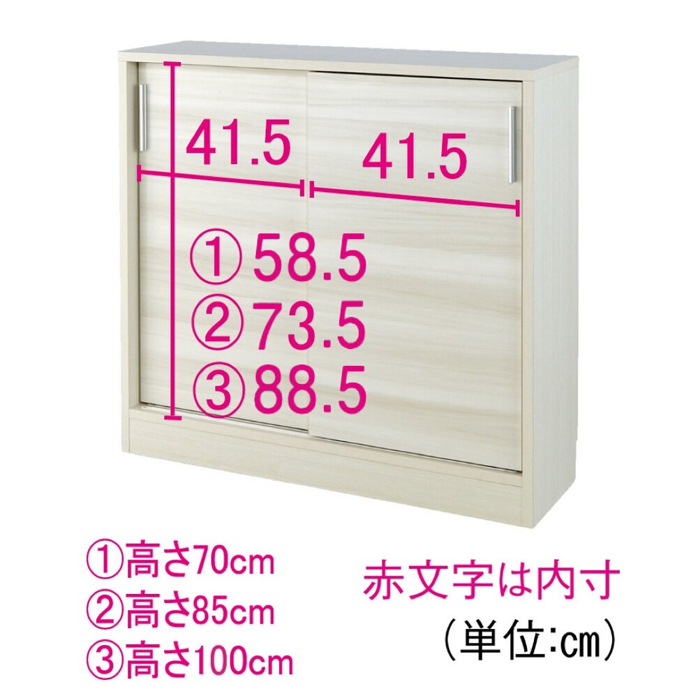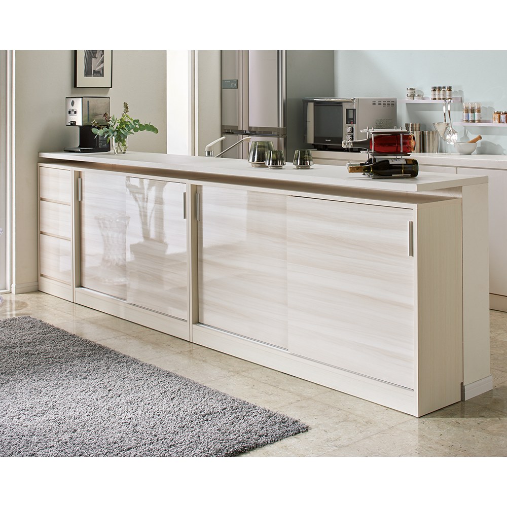 美しい光沢を放つ木目で上質かつスタイリッシュな収納を実現するカウンター下収納です。お部屋に高級感を添えるシックで温かみのある色合いの引き戸収納庫です。カウンター下のデッドスペースを活かし、部屋の主役顔になるスタイリッシュな収納庫です。◆モダンな印象の光沢木目がおしゃれなカウンター下収納です。◆リビングやダイニングの生活感を隠すことができます。薄型+引き戸で無駄なスペースを作らない頼りになる収納庫奥行30cmの薄型の収納庫です。引き戸タイプなので開閉に場所を取らず、テーブル脇などの限られたスペースでもご使用いただけます。薄型スリム収納で本棚や食器棚、CD、DVD収納として隙間を有効活用できます。1. 省スペース型(奥行き30cm)のカウンター下収納庫で、設置場所によりリビング収納、窓下収納にもなり大変便利です。2. 取っ手はシルバーのすっきりした、本体とマッチしたデザインを採用。3. 本体はオレフィン化粧シートを採用、お手入れが楽な素材です。4. 本体側板は巾木カット仕様、すっきり本体が設置場所に収まります。使い勝手にこだわった機能性 ◆本体内の棚板は、3cm間隔の可動式。 収納物に合わせて好きな位置に設定できます。選べる3サイズの高さ設計◆高さ70cmは一般的なダイニングテーブルと同じ程度の高さ。テーブルの延長線上に収納庫の天板が来るので、天板をちょい置きスペースとしても使用できます。◆高さ85cmはカウンター下にすっきり納まりやすいサイズです。カウンター下だけでなくリビング収納にもおすすめです。◆高さ100cmは高さのあるキッチンカウンター下や、リビング収納としておすすめです。収納量たっぷりなので、ごちゃつきがちなリビング小物を一気に目隠し収納できます。シックで温かみのある2色の木目柄 ◆お部屋のインテリアに合わせてお選びいただける、光沢の美しい2色をご用意しました。(ア)ホワイト 繊細な白い木目模様が、お部屋に美しく溶け込みます。(イ)ブラック シックでモダンな黒の輝きで、ワンランク上のおしゃれなリビングルームに。引き戸収納庫と合わせたデザインのチェストも別売りでご用意◆幅25cm〜45cmのオーダーが可能なチェストもシリーズでご用意。