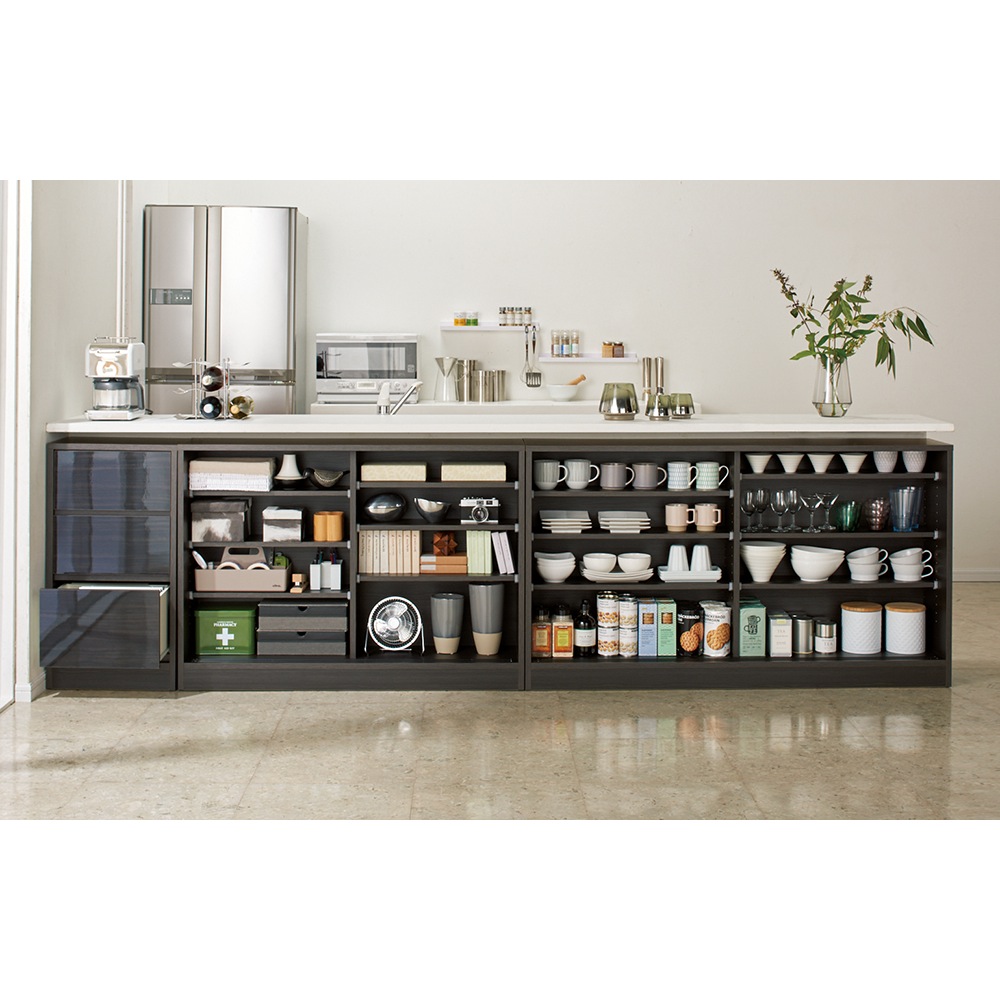 コーディネート例(イ)ブラック木目 生活感が出やすい小物類を目隠し収納できます。(※写真は扉を外して撮影しています)