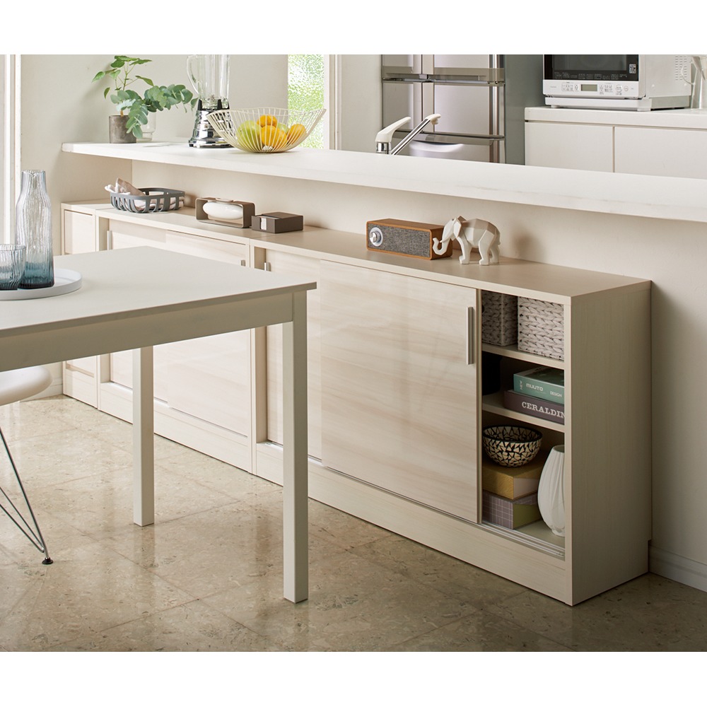コーディネート例(ア)ホワイト木目 引き戸だからテーブル近くでも開閉可能。テーブルとつなげて、ちょい置きスペースにも。 ※写真は高さ70cmタイプ