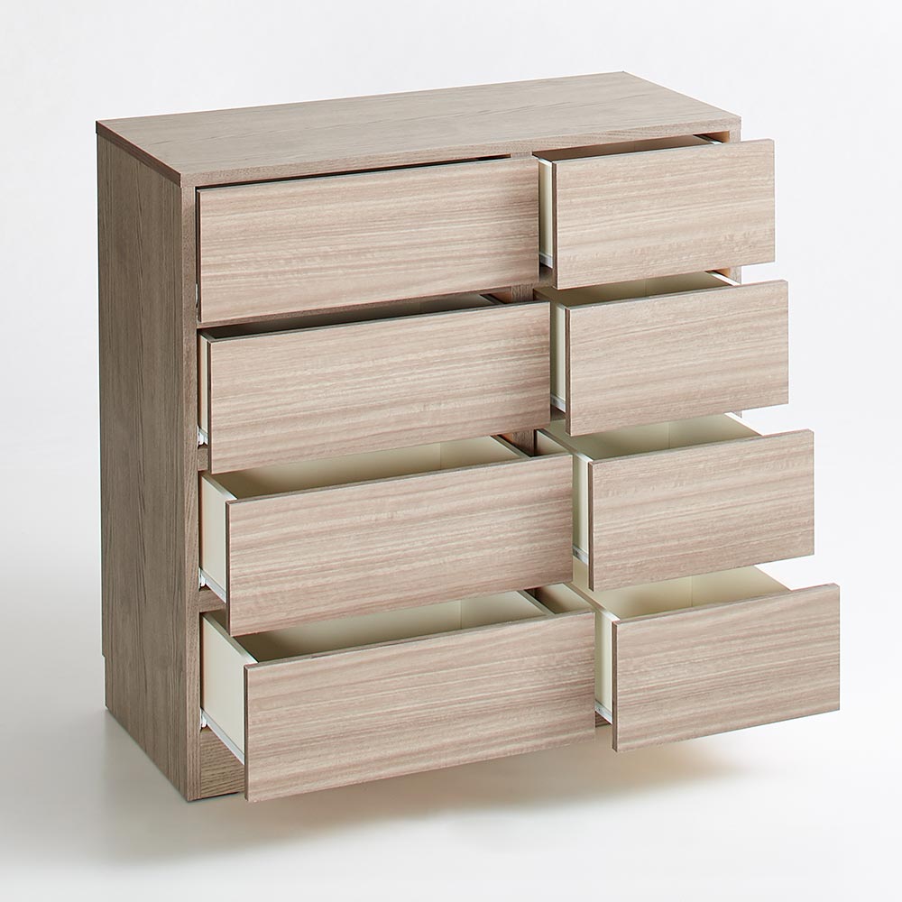 引き出したくさんで小分け収納が可能な多段チェスト。整理整頓は勿論、衣類・下着類の型崩れもしにくく快適な衣類管理が可能に。衣装持ちさんやおしゃれなランジェリーを集めている方にぴったりな洋服タンスです。大切なお洋服を守るための機能性や衣替えのしやすさもポイントです。整理整頓しやすい引き出したくさんの多段チェストどんどん増える衣類と下着類。大きな衣装ダンスはたくさん物が入って便利ですが、分類収納が大変で中身がごちゃつくことも。そのためには初めから小分けされた引き出しが便利。引き出しごとに分類収納すれば、中身がきれいに整理されるだけでなく、衣類や下着類の型崩れもしにくく一石二鳥です。シンプルな外観とトレンドのシックなカラーに、収納物に配慮した機能性が魅力の衣類収納チェストです。分類収納も楽々。下着やランジェリー類の型崩れも防ぐ引き出しのサイズがこだわり■向かって右側の幅の狭い引き出しは内寸がおよそ27cmでランジェリーがちょうどよく収まる幅サイズに。■お気に入りの下着は型崩れさせず大事にしまっておきたいもの。綺麗に重ねて並べれば安心に収納できるのでおすすめです。■そのほか、幅の狭い引き出しは靴下やショーツ、キャミソールなどのインナー類の収納にお勧めです。季節や色、家族それぞれの物を分類すれば管理も簡単です。収納物に配慮した、こだわりの機能性で衣類を大切に守ります■引き出し内部は清潔感のあるホワイトカラーで化粧を施し、収納物に配慮しました。■本体の地板は奥までしっかり幅を持たせることで、収納した衣類の引っ掛かりを軽減。本体の強度をより高める効果も。■引き出しには開閉・出し入れがスムーズなコロ付きスライドレールを採用。■コロ付きスライドレールは引き出しの取り外しが簡単なのが魅力。■幅が同じ引き出しはすべてサイズが共通なので、引き出しごと入れ替えて、オフシーズンのアイテムもスムーズに衣替え。大容量の収納力で、手持ちの衣類をまとめて収納。選べるサイズバリエーションも魅力。■設置した居場所・お手持ちの衣類に合わせて選べる6種類のサイズバリエーション。■本体奥行き45cmのたっぷりとした大量収納でこれ一台で畳みものの衣類と下着類をまとめて収納が可能です。トレンドインテリアから定番まで。シンプルデザインでもおしゃれに決まる3色のバリエーションチェストらしいシルエットやサイズ感はそのままに、おしゃれなインテリアスタイルを損ねないカラーバリエーションでご用意しました。なりたいお部屋のスタイルや、お住まいのお部屋の内装に合わせてお選びいただけます。ホワイト木目わずかにアイボリー色がかったホワイトカラー。遠目では目立たない程度の木目柄で、壁紙クロスにも馴染む定番のカラーです。圧迫感を感じさせず狭いお部屋・狭い家に設置するのであればこちらがおすすめ。王道のシンプルなインテリアから、北欧インテリア、ナチュラルベーシックなウォークインクローゼット等幅広く活躍するカラーです。グレーウォールナット天然木調ウォルナット柄にわずかにグレーがかったダークブラウン系で、昨今の新築の住宅やマンションに多い建材に合わせたカラー。木目調ながらクールでモダンな印象で、生活感を感じさせないヨーロピアンスタイル・ヨーロッパ風のワードローブやモノトーンインテリア、アンティーク風なワードローブのアクセントとして映えるカラーです。ブラック木目シックな木目柄に黒いカラーで落ち着いた大人な雰囲気。こちらもホワイト木目と同じく、光の当たり具合によってはあまり木目柄は目立たずマットブラックにも見えるお色です。シャープな印象でブルックリンスタイル、ヴィンテージやインダストリアルスタイルなどの個性的なクローゼットを演出できます。和室や和モダンな雰囲気の寝室にもマッチします。信頼と安心の国内工場での生産品の衣類収納箪笥・衣類収納チェスト■国内の職人がひとつずつ丁寧に仕上げた日本製のワードローブ・衣類タンスです。■細部の丁寧な仕上がりなど、国産品ならではの高品質な洋服タンス・衣装ケースをお楽しみください。面倒な組み立てのいらない完成品■組み立て不要の完成商品でのお届けになります。届いたその日からすぐにご使用いただけます。