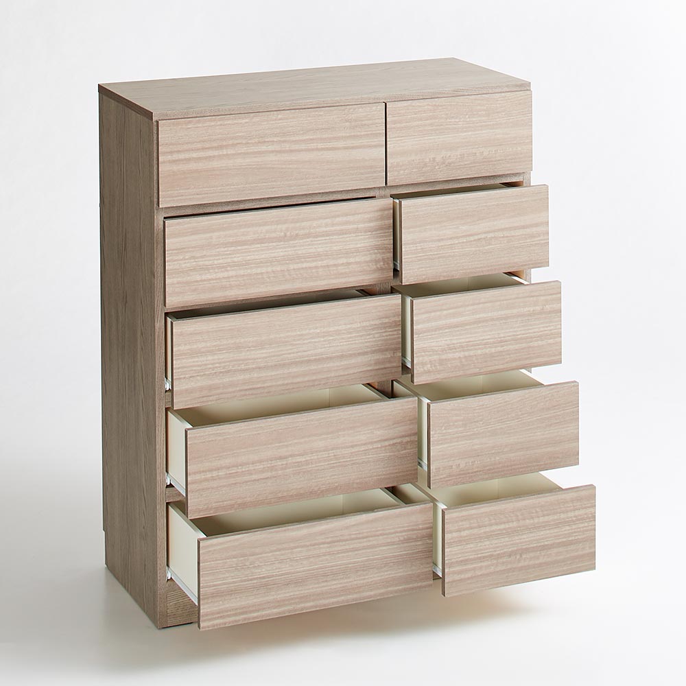 引き出したくさんで小分け収納が可能な多段チェスト。整理整頓は勿論、衣類・下着類の型崩れもしにくく快適な衣類管理が可能に。衣装持ちさんやおしゃれなランジェリーを集めている方にぴったりな洋服タンスです。大切なお洋服を守るための機能性や衣替えのしやすさもポイントです。整理整頓しやすい引き出したくさんの多段チェストどんどん増える衣類と下着類。大きな衣装ダンスはたくさん物が入って便利ですが、分類収納が大変で中身がごちゃつくことも。そのためには初めから小分けされた引き出しが便利。引き出しごとに分類収納すれば、中身がきれいに整理されるだけでなく、衣類や下着類の型崩れもしにくく一石二鳥です。シンプルな外観とトレンドのシックなカラーに、収納物に配慮した機能性が魅力の衣類収納チェストです。分類収納も楽々。下着やランジェリー類の型崩れも防ぐ引き出しのサイズがこだわり■向かって右側の幅の狭い引き出しは内寸がおよそ27cmでランジェリーがちょうどよく収まる幅サイズに。■お気に入りの下着は型崩れさせず大事にしまっておきたいもの。綺麗に重ねて並べれば安心に収納できるのでおすすめです。■そのほか、幅の狭い引き出しは靴下やショーツ、キャミソールなどのインナー類の収納にお勧めです。季節や色、家族それぞれの物を分類すれば管理も簡単です。収納物に配慮した、こだわりの機能性で衣類を大切に守ります■引き出し内部は清潔感のあるホワイトカラーで化粧を施し、収納物に配慮しました。■本体の地板は奥までしっかり幅を持たせることで、収納した衣類の引っ掛かりを軽減。本体の強度をより高める効果も。■引き出しには開閉・出し入れがスムーズなコロ付きスライドレールを採用。■コロ付きスライドレールは引き出しの取り外しが簡単なのが魅力。■幅が同じ引き出しはすべてサイズが共通なので、引き出しごと入れ替えて、オフシーズンのアイテムもスムーズに衣替え。大容量の収納力で、手持ちの衣類をまとめて収納。選べるサイズバリエーションも魅力。■設置した居場所・お手持ちの衣類に合わせて選べる6種類のサイズバリエーション。■本体奥行き45cmのたっぷりとした大量収納でこれ一台で畳みものの衣類と下着類をまとめて収納が可能です。トレンドインテリアから定番まで。シンプルデザインでもおしゃれに決まる3色のバリエーションチェストらしいシルエットやサイズ感はそのままに、おしゃれなインテリアスタイルを損ねないカラーバリエーションでご用意しました。なりたいお部屋のスタイルや、お住まいのお部屋の内装に合わせてお選びいただけます。ホワイト木目わずかにアイボリー色がかったホワイトカラー。遠目では目立たない程度の木目柄で、壁紙クロスにも馴染む定番のカラーです。圧迫感を感じさせず狭いお部屋・狭い家に設置するのであればこちらがおすすめ。王道のシンプルなインテリアから、北欧インテリア、ナチュラルベーシックなウォークインクローゼット等幅広く活躍するカラーです。グレーウォールナット天然木調ウォルナット柄にわずかにグレーがかったダークブラウン系で、昨今の新築の住宅やマンションに多い建材に合わせたカラー。木目調ながらクールでモダンな印象で、生活感を感じさせないヨーロピアンスタイル・ヨーロッパ風のワードローブやモノトーンインテリア、アンティーク風なワードローブのアクセントとして映えるカラーです。ブラック木目シックな木目柄に黒いカラーで落ち着いた大人な雰囲気。こちらもホワイト木目と同じく、光の当たり具合によってはあまり木目柄は目立たずマットブラックにも見えるお色です。シャープな印象でブルックリンスタイル、ヴィンテージやインダストリアルスタイルなどの個性的なクローゼットを演出できます。和室や和モダンな雰囲気の寝室にもマッチします。信頼と安心の国内工場での生産品の衣類収納箪笥・衣類収納チェスト■国内の職人がひとつずつ丁寧に仕上げた日本製のワードローブ・衣類タンスです。■細部の丁寧な仕上がりなど、国産品ならではの高品質な洋服タンス・衣装ケースをお楽しみください。面倒な組み立てのいらない完成品■組み立て不要の完成商品でのお届けになります。届いたその日からすぐにご使用いただけます。