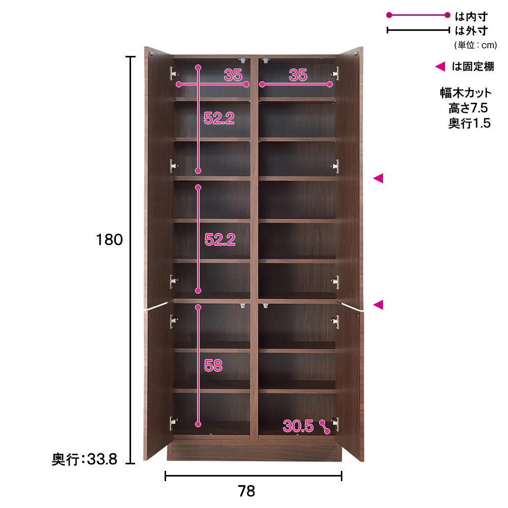 「眺める」「見せる」を、心ゆくまで楽しむ。生活感は扉収納で美しく目隠し。しっかり隠す板扉タイプ。美しくしまう、このことを徹底的に考え抜いた収納庫です●お気に入りは、美しく見せたい、でもホコリから守りたい。そんな希望にこたえます。●国内のオーダー家具工場で1点1点丁寧に仕上げたハイクオリティ仕様。●モノづくりにプライドを持って、生産しています。●壁一面に、設置すれば、それはまるでハイクラスマンションのモデルルームのような空間に。美しさを保つため、細部にこだわったハイクラス仕様●上質な商品をお届けするために、工場を厳選。●家具に対する情熱をたっぷり持った、国内工場で生産しています。●ハイクラスさは、部材の一つ一つの選定にまで、あらわれてくるもの。●見た目の美しさ、使い勝手のよさ、耐久性 … 細かく考慮し、部材の選定を行っています。●幅木除けカットを施し、壁ぴったりに設置できます。●転倒防止バンド付きで地震対策も。扉でしっかりホコリ対策●大好きなコレクションは、汚れから守りたいもの。●扉でしっかり、対策を。●扉はプッシュ式で、開け閉めも簡単です。棚板は可動式●設置したいものに合わせて、高さを3cmピッチで変更できます。