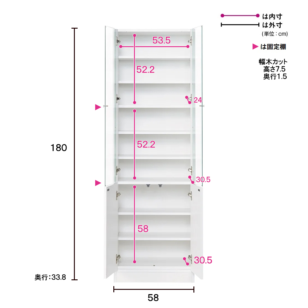 「眺める」「見せる」を、心ゆくまで楽しむ。生活感は扉収納で美しく目隠し。埃から守りながらも、コレクションを眺められる、ガラス扉タイプ。美しくしまう、このことを徹底的に考え抜いた収納庫です●お気に入りは、美しく見せたい、でもホコリから守りたい。そんな希望にこたえます。●国内のオーダー家具工場で1点1点丁寧に仕上げたハイクオリティ仕様。●モノづくりにプライドを持って、生産しています。●壁一面に、設置すれば、それはまるでハイクラスマンションのモデルルームのような空間に。美しさを保つため、細部にこだわったハイクラス仕様●上質な商品をお届けするために、工場を厳選。●家具に対する情熱をたっぷり持った、国内工場で生産しています。●ハイクラスさは、部材の一つ一つの選定にまで、あらわれてくるもの。●見た目の美しさ、使い勝手のよさ、耐久性 … 細かく考慮し、部材の選定を行っています。●幅木除けカットを施し、壁ぴったりに設置できます。●転倒防止バンド付きで地震対策も。扉でしっかりホコリ対策●大好きなコレクションは、汚れから守りたいもの。●扉でしっかり、対策を。コレクションを「眺め」ることができる、ガラス戸●ガラス扉を採用しているので、収納しても眺めることが可能です。●ガラス戸に指紋がつかないよう、小さ目の取っ手をつけています。●取っ手が小さ目なので、全体の上質な雰囲気を損ねることがありません。棚板は可動式●設置したいものに合わせて、高さを3cmピッチで変更できます。