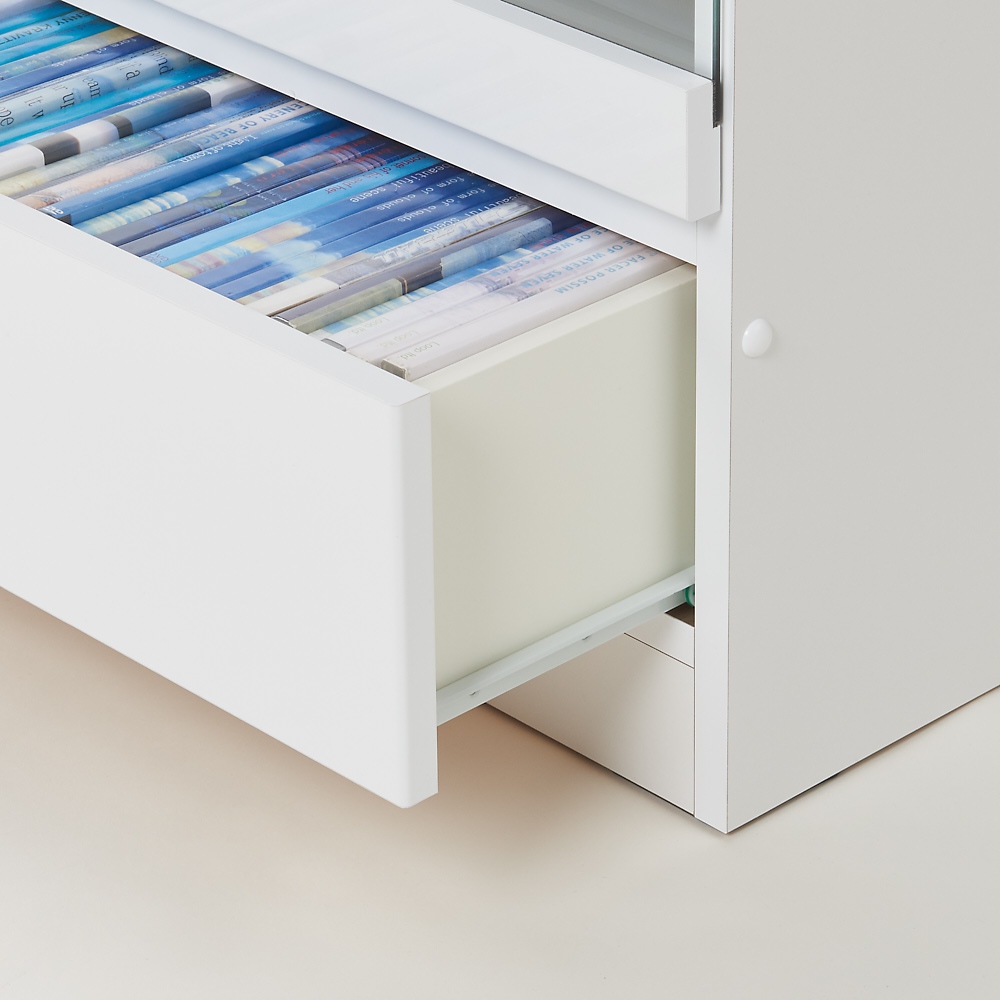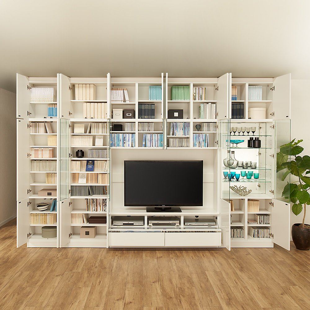 ガラス扉で「見せる」「ほこり対策」を両立 板棚タイプは本棚としても。写真集など、背表紙を見せたいものに。