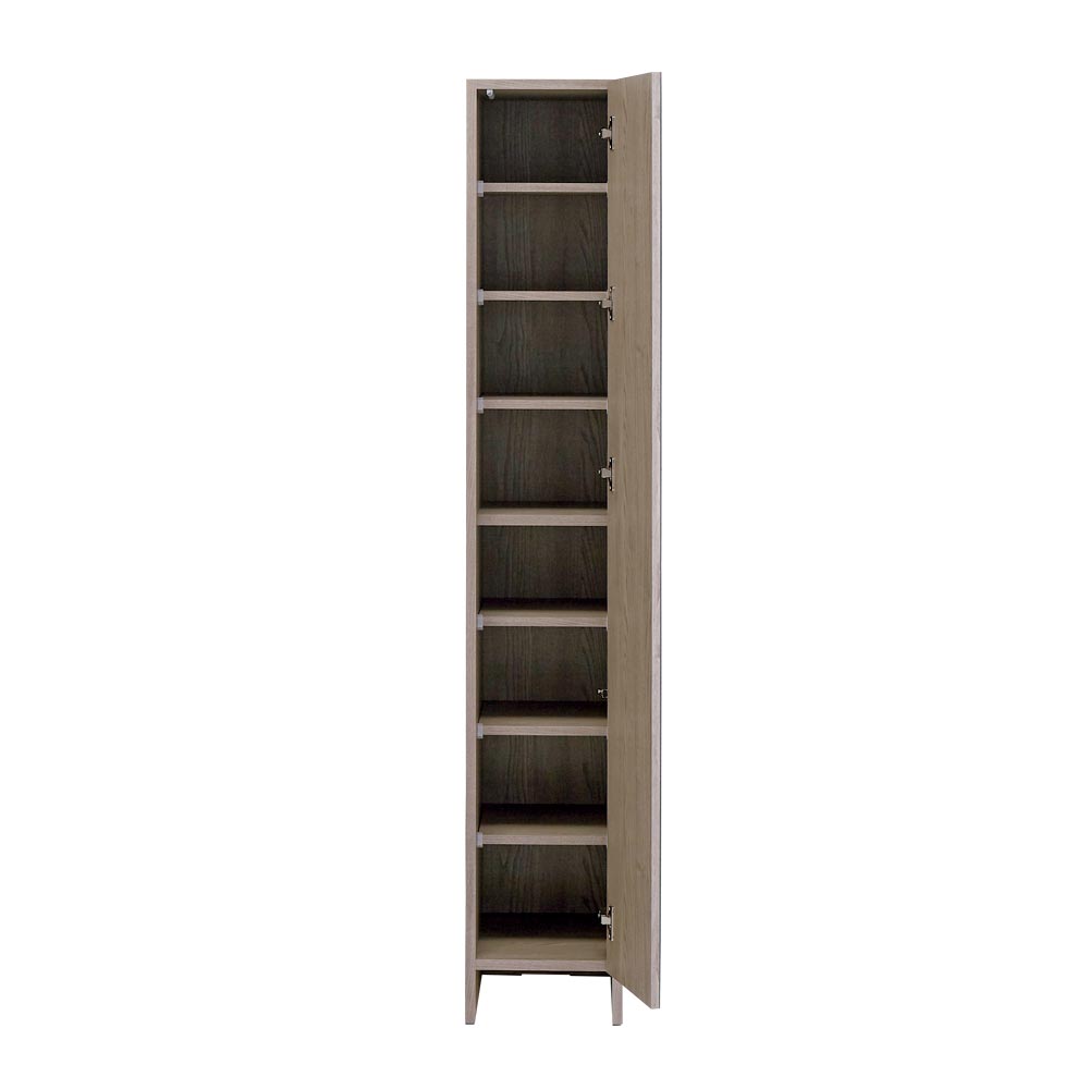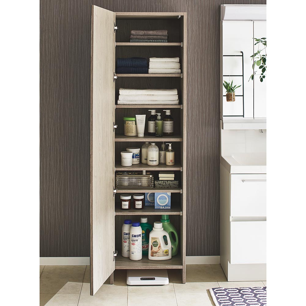 (イ)グレーウォルナット 姿見を兼ねたストッカーは、余裕のない洗面所周りを広く感じさせる効果も。