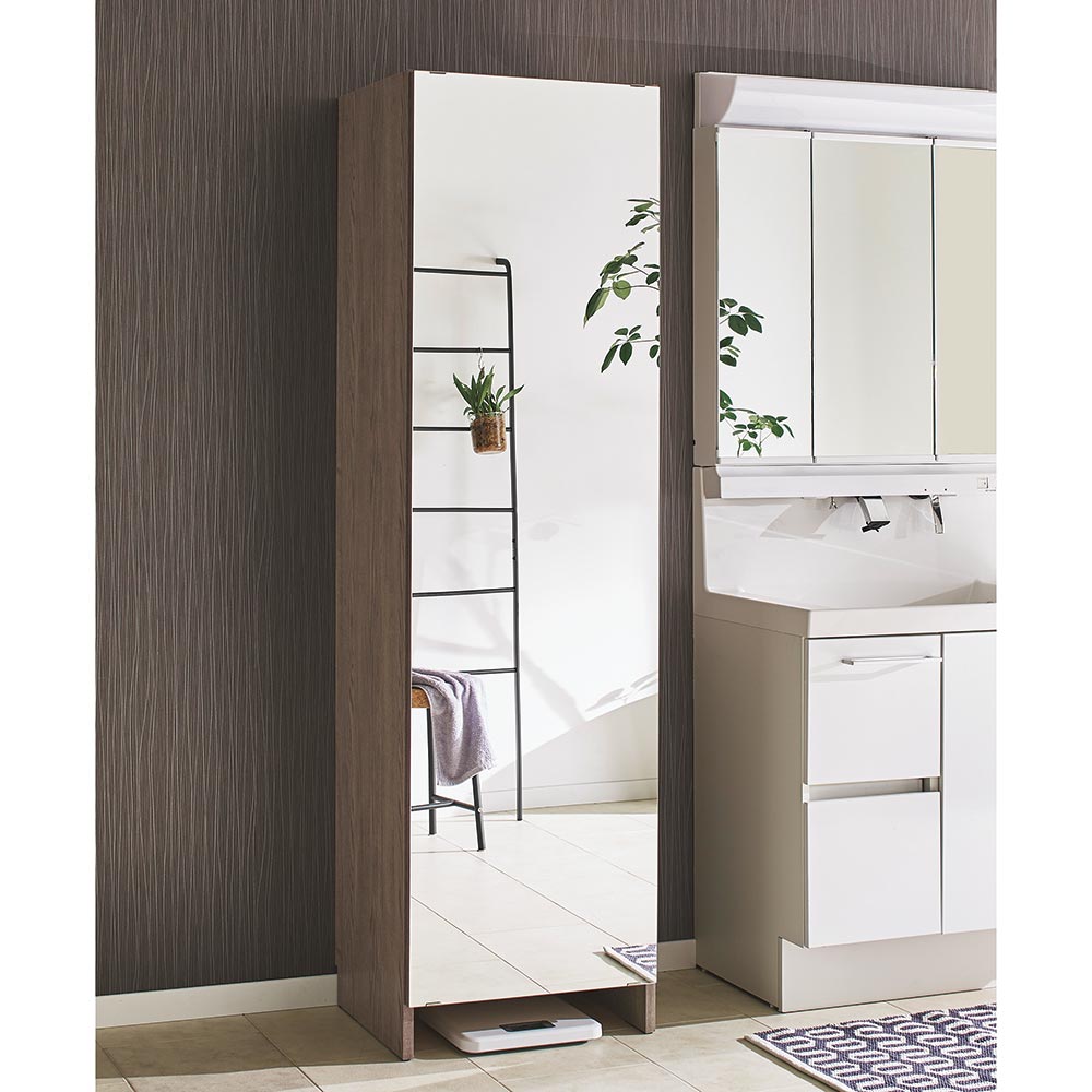 (イ)グレーウォルナット 姿見を兼ねたストッカーは、余裕のない洗面所周りを広く感じさせる効果も。