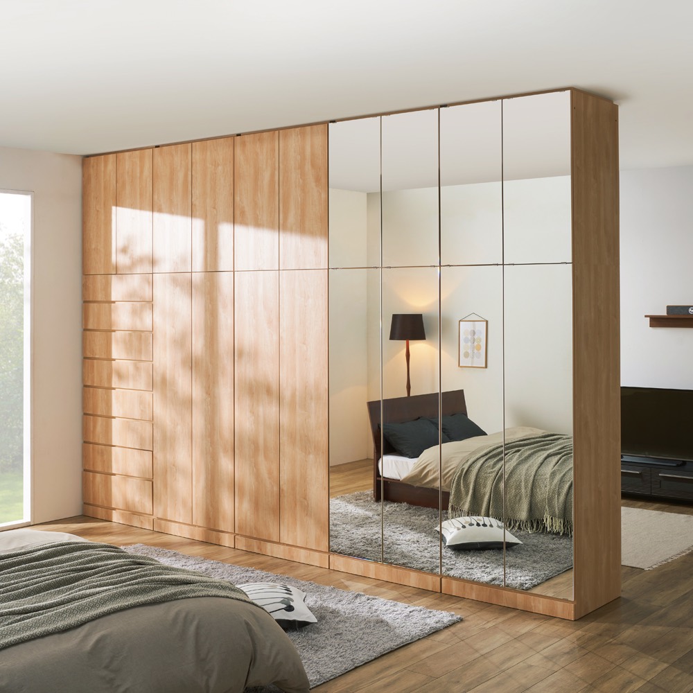 ワードローブと間仕切り機能の1台2役の間仕切り家具。 ミラータイプの扉は姿見としてだけでなくお部屋を広々と演出してくれます。造り付けのようにお部屋を広々演出する間仕切りミラーワードローブシリーズ。●空間を間仕切りながら、大量収納まで叶えてくれる間仕切り収納。●扉はミラータイプと板扉タイプからお選びいただくことができます。●ミラータイプの扉なら姿見としてはもちろん間仕切ったお部屋を広々と演出してくれます。●色は清潔感のあるホワイトと木目が美しく温かみのあるナチュラルの2色からお選びいただけます。背面も美しい化粧仕上げ●間仕切り仕様の背面も木パネルを貼り合わせた高級仕様。間仕切り家具として仕様した場合でもしっかりと壁面になってくれます。●間仕切りとしてだけでなく壁面に設置してもご使用いただけます。収納物や設置場所に応じて10タイプ(+上置き)を自由に組み合わせてお使いいただけます。●商品の幅は60cmと80cmの2タイプ。●収納タイプはハンガー2段・ブレザー(上段:ハンガー、下段:引き出し2杯)・棚・棚引き出し3杯・タワーチェストの5タイプをご用意。●使う場所や収納量に応じて専用の突っ張り固定式の上置きもお選びいただけます。仕分けて収納できる【棚引き出し3杯タイプ】●4枚の可動棚は3cmピッチで調整可能なため収納物に応じて自由に高さを調整することができます。●下段には引き出しが3杯ついているため棚タイプよりも視認性がよく収納物が取り出しやすいです。●引き出しはストッパー付きスライドレールでスムーズに引き出せます。●棚収納と引き出し収納で仕分け収納ができます。使いやすさにもしっかりこだわりました。●扉はプッシュラッチ式で埃も防ぐ防塵フラップ付きです。●床から扉の底辺までは約10cmの台輪付きなので、開閉時にラグなどを引きずることもありません。熟練の家具職人がひとつずつ丁寧に仕上げる日本製(国産)家具●安心と信頼の日本製で届いたその日からご使用いただける組み立て不要の完成品です。●大切な衣類やシューズ、バッグ、帽子類を安心して収納していただけます。●まるで造り付け家具のような存在感で引っ越しやマンションリフォームの際にもおすすめの商品です。