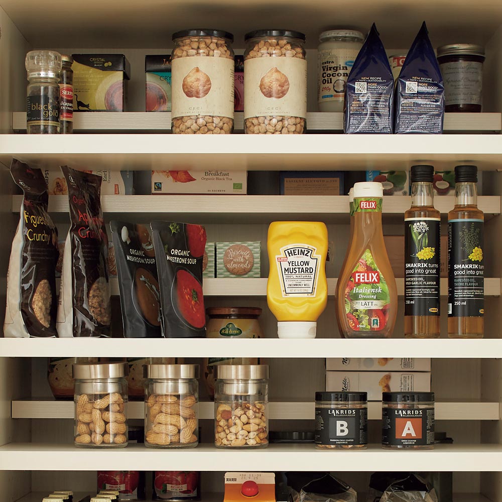 高さが変えられるハーフ棚で、ストックものもたっぷり入ります前後で高さが変えられるハーフ棚。3cm間隔で調節可能なので、収納したいものに合わせて自由にカスタマイズできます。