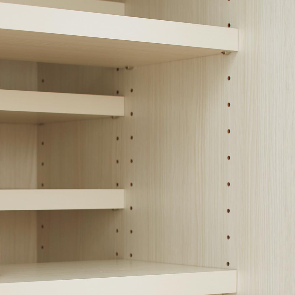• 前後ハーフ棚でストック類も大量に収納できます。奥まで見やすく、取り出しやすい仕様です。 (ア)ホワイト木目 ※写真は幅70奥行56cmタイプ