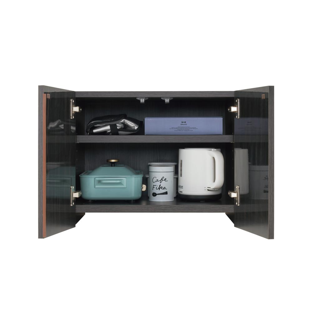 幅58〜68cmの一般的な冷蔵庫サイズにはもちろん、大型サイズをお持ちのお客様にもぴったりの幅73〜83cm展開をご用意。ホットプレートなど、置き場所に困るものはデッドスペースにかしこく収納。前面にはオレフィンシートを使用し、高級感と耐久性を両立しました。冷蔵庫付近のデッドスペースを有効活用しませんか?冷蔵庫の上と横のすき間は収納を増やせるチャンススペース。使う頻度の低い家電は上に、調味料などの大量のストックものは横にしまうことで、キッチンスペースをスッキリ整理できます。ご自宅の冷蔵庫サイズに合わせて選べる12サイズ展開幅58/63/68/73/78/83、奥行44/56cmからそれぞれ選べます。(高さは46cmで共通)作り置きなどの事情で大きめの冷蔵庫を使っているお家はその分上のデッドスペースも広いので、ぴったりサイズが見つかるようにしました。冷蔵庫上のスペース確認方法は、下記をご参照ください。1.ご自宅の冷蔵庫サイズを計測:幅○○×奥行○○cm2.冷蔵庫天板から天井までの高さを計測:高さ○○cm3.幅・奥行・高さそれぞれ−1cm以内で当てはまるサイズの商品を選択※ご購入前に、冷蔵庫の上が使用できるかご確認ください高級感と耐久性を両立したつくりもポイント前面には光沢のあるオレフィンシートを使用。ツヤツヤとした木目柄は上品な雰囲気を演出します。さらに水・汚れに強く、キレイを長く保ちます。※汚れが気になる際は濡れたタオルで優しく拭き取ってください。扉はプッシュ式でワンタッチで開け閉めができ、シンプルな見た目にこだわりました。棚板は3cmピッチ5段階で高さ調節が可能です。冷蔵庫天板は凸凹している場合があり、また放熱を考えてアジャスターを取り付けています。アジャスターは設置時にご調整ください。安心と信頼の職人技が光る国産の収納家具熟練の家具職人がひとつずつ丁寧に仕上げたワンランク上の日本製です。細部の丁寧な仕上がりなど日本製の高品質な収納家具で快適な暮らしを。本体は組立不要。届いたらすぐ使えるのが嬉しい完成品でお届けします。商品担当者からのメッセージ冷蔵庫は様々なサイズがありますが、高さは160cm〜180cmが多いです。天井との間に絶妙なスペースができてしまう…それならば冷蔵庫の上に収納を増やしたいですよね。普段はあまり使わないけれど、保管場所に困るホットプレートやお菓子の道具など、まとめて収納することができます。見た目は高級感があり、水や汚れに強い機能性を両立したシートを使用しているので、使う時も安心です。ご自宅のキッチンの雰囲気に合わせて、ホワイト木目/ブラック木目をお選びください。同シリーズのパントリー収納とセットでお求めいただくのもおすすめです!