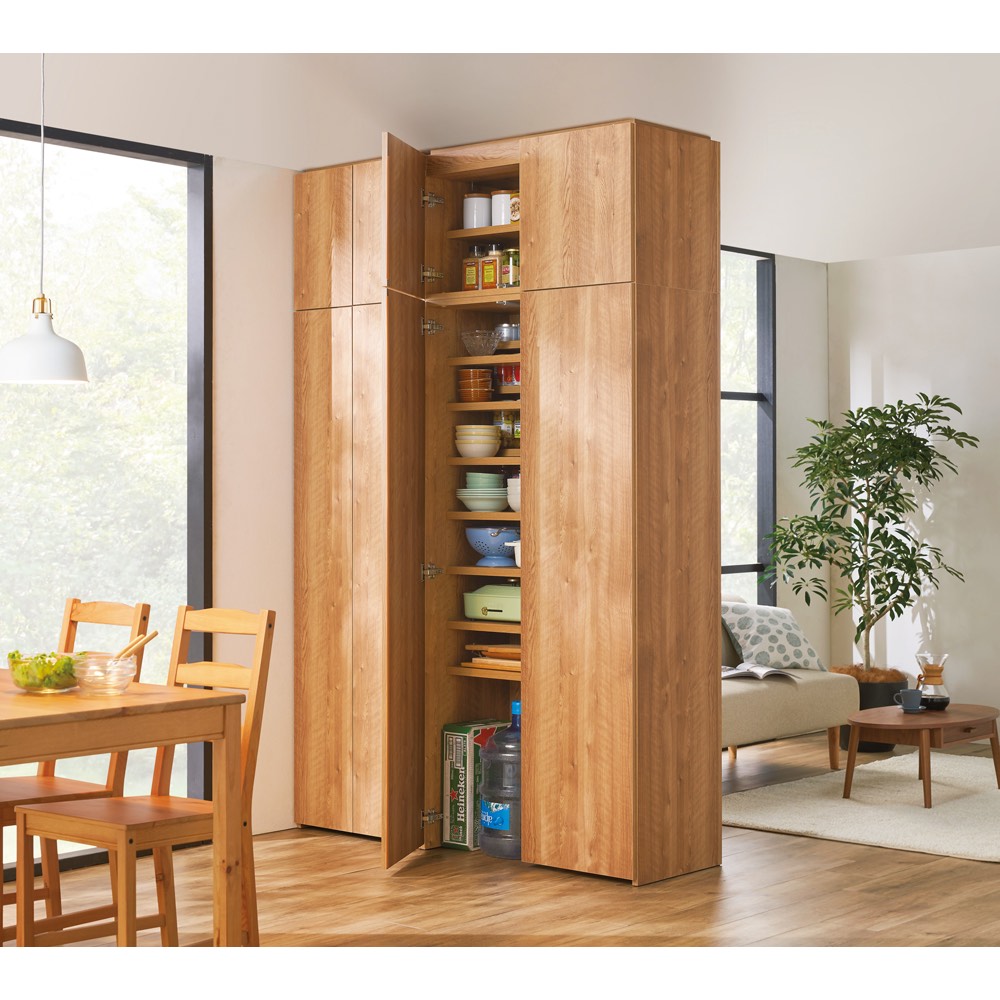 空間を分けて住みやすく、パントリーも増設できる収納が新登場!間仕切り仕様で、ペットボトルやビール缶のカートン、大量の食器、食品ストックや買い置きをぎっしりしまえるキッチン収納です。〜リビングやダイニングを間仕切りながら収納できるキッチン収納〜空間を間仕切りながら、大容量収納まで叶えてくれる間仕切り収納。背面が美しい化粧仕上げで、空間を間仕切って使うことができます。リビング収納、キッチン収納、ベッドサイド、書斎など目的に応じて収納を増やしながらお部屋を仕切ることが可能です。小さな調味料からビールケースまで、サイズに応じて効率収納!キッチン収納を上手く使いこなす3つのアイディアとは?(1)食器や調味料などサイズが様々なものは上スペースの「段違い棚」に効率収納。(2)飲料ケースやストック、鍋など重くてかさばるものは下スペースの「最下段」にたっぷり収納。(3)底板がない仕様なので、重いものやキャスターのついたものの出し入れがラクラク。毎日使うものだから、使い勝手にこだわりました。◆上部は、前後で高さが変えられる段違い棚。3cm間隔で高さ調整できます。◆下段の棚は可動式。3cm間隔で高さ調整可能。◆固定式の棚は、床から約90cmの位置にあるので、掃除機など高さのあるものも収納できます。◆扉はプッシュ式なので、簡単に開閉できます。お部屋に調和する美しいインテリア性の食器棚◆部屋との調和を意識し、ナチュラルな素材感が美しい(ア)ホワイト(イ)ブラウン(ウ)ダークブラウンの3色をご用意。キッチンだけでなく、洗面所や玄関、リビング収納などさまざまな場所での活躍が期待できます。シリーズ商品の上置きと合わせて、造り付けのような収納が実現します。◆シリーズ商品で上置きをご準備。ご自宅の天井までぴったり、作り付けのような収納が作れます。安心と信頼の国内生産品◆熟練の家具職人がひとつずつ丁寧に仕上げたキッチン収納・食品ストッカー・食器棚です。◆細部の丁寧な仕上がりなど、国産品ならではの高品質をお楽しみください。◆引っ越しやリフォームのタイミングにもおすすめの商品です。
