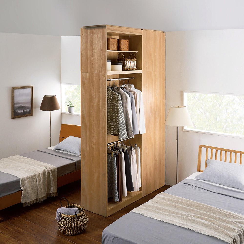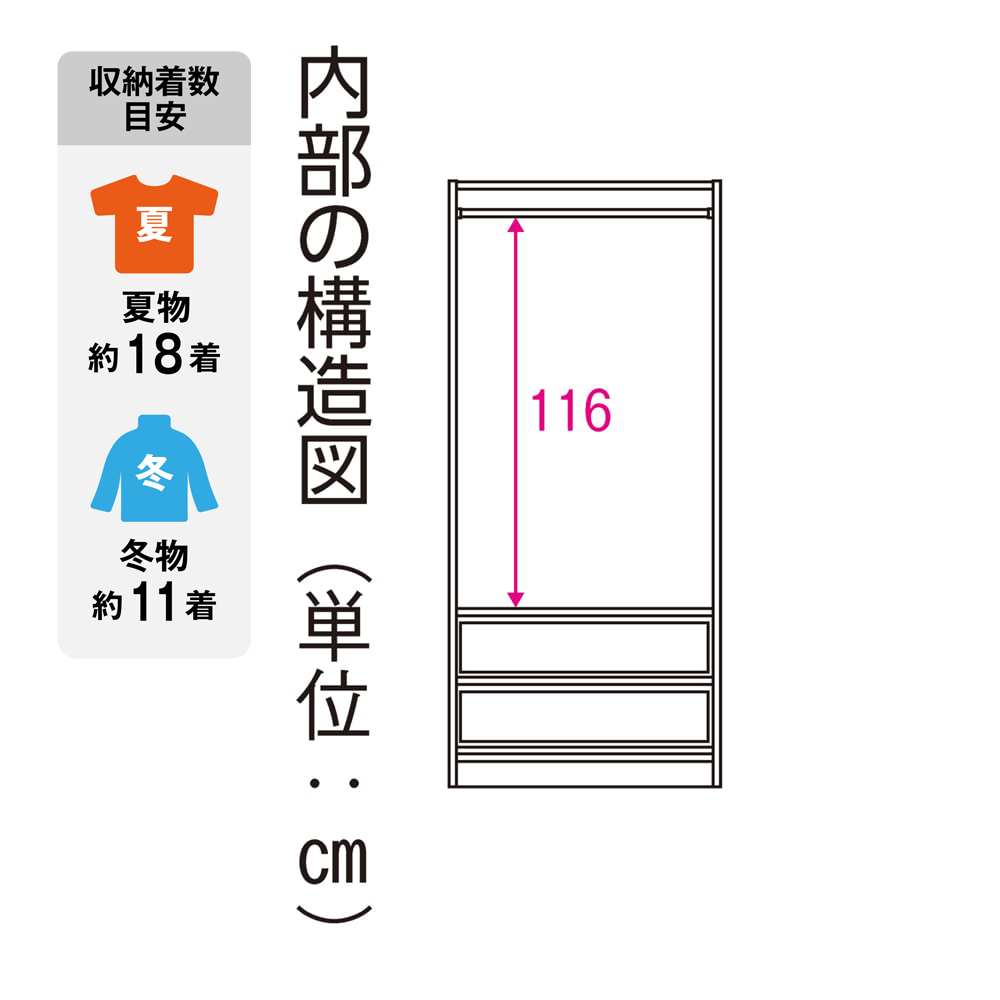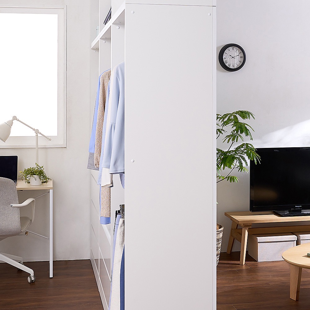 奥行と収納タイプが選べ、ワードローブと間仕切り機能の1台2役の間仕切り収納シリーズ。上置きを設置すれば天井までの大量収納が叶います。右手前からハンガー2段 幅60cm、ハンガー1段+引き出し幅80cm、棚+引き出し幅80cm(いずれも奥行44cm、ホワイト、シリーズ品の上置き使用)収納と間仕切りの1台2役!お部屋の用途が広がりますワードローブと間仕切り機能、1台2役の衣類収納シリーズ。空間を仕切りながら、大容量収納まで叶えてくれます。幅・奥行・収納タイプが選べ、上置きを設置すれば天井までのスペースも有効活用。まるで造り付けのような収納空間が完成します。お届け商品 ※右:内部の構造図(単位cm)ハンガー+引出しタイプ 幅60cm奥行44cm1段のハンガー収納と引き出し2杯のタイプ。掛ける収納・たたむ収納の使い分けができます。左から 上下ハンガー2段(幅80cm)、ハンガー+引出し(幅80cm)、棚+引出し(幅60cm)選べる収納タイプ・サイズ使い勝手や収納物に応じて、幅・収納タイプを選び、自由に組み合わせてお使いいただけます。 収納タイプは上下ハンガー2段タイプ、ハンガー+引出しタイプ、棚+引出しタイプの3種類、幅は60cm・80cmの2サイズをご用意。色はホワイト・ナチュラル・ダークブラウンの3色。お部屋のインテリアに合わせてお選びください。 ※お届け商品は「奥行44cm」タイプです奥行スリム&オープンタイプで省スペース扉のないオープンタイプで、開閉スペースが不要な省スペース設計です。 奥行は44cmと54cmの2サイズをご用意。お部屋に合わせてお選びください。奥行44cm:ジャケットの肩は少し出るけれど、十分な収納力。あまりスペースがなく、省スペースで使いたい方におすすめ。 奥行54cm:衣類をすっぽり隠すように収納できるので、お部屋がよりスッキリ見えます。出し入れラクな引き出し引き出しは、スムーズに動くスライドレール式。上置き使用例突っ張り式の上置きで収納力UP収納力をUPしながら、本体をしっかりと固定する「突っ張り式上置き(別売)」と組み合わせて使うことができます。上置きはご自宅の天井の高さに応じて、1cm単位でオーダー可能。 上置きとの組合せ次第で、天井高208〜272cmに対応します。 コーディネート例:ホワイト(収納面)お部屋を広く演出するホワイト壁馴染みが良く、大きな家具でも圧迫感が出にくいのが特徴。コーディネート例:ダークブラウン(間仕切り面)高級感のあるダークブラウンまるでウォルナット材のように、落ち着いた印象の木目柄。モダンなスタイルにピッタリのデザイン。 リビングを仕切って、片側をベッドスペースにすることも。コーディネート例:ナチュラル(収納面)柔らかな印象のナチュラル綺麗な木目柄で、北欧風のナチュラル色。インテリアを選ばず、どんなスタイルにも合わせやすいのがポイントです。ふたりで部屋をシェアしながら、収納も確保。