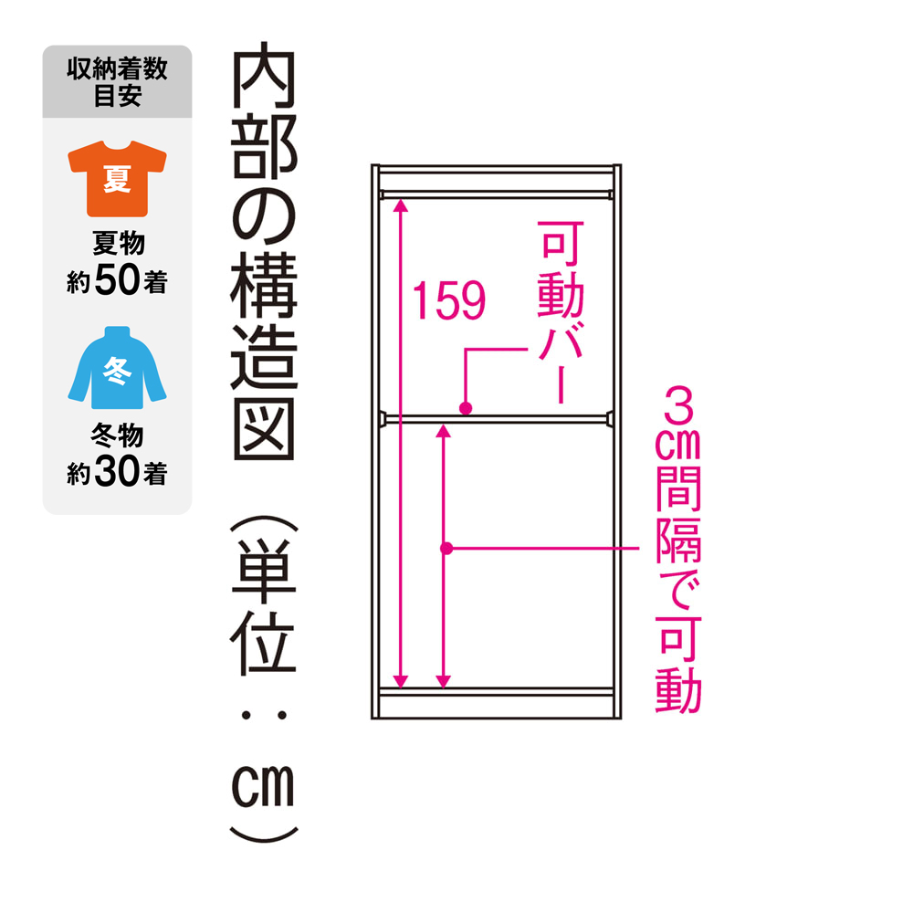奥行と収納タイプが選べ、ワードローブと間仕切り機能の1台2役の間仕切り収納シリーズ。上置きを設置すれば天井までの大量収納が叶います。右手前からハンガー2段幅60cm、ハンガー1段+引き出し幅80cm、棚+引き出し幅80cm(いずれも奥行44cm、ホワイト、シリーズ品の上置き使用)収納と間仕切りの1台2役!お部屋の用途が広がりますワードローブと間仕切り機能、1台2役の衣類収納シリーズ。空間を仕切りながら、大容量収納まで叶えてくれます。幅・奥行・収納タイプが選べ、上置きを設置すれば天井までのスペースも有効活用。まるで造り付けのような収納空間が完成します。お届け商品 ※右:内部の構造図(単位cm)ハンガー2段タイプ 幅80cm奥行44cm2段のハンガー収納。下段のハンガーバーは、3cm間隔で高さ調節ができ、取り外しも可能です。左から 上下ハンガー2段(幅80cm)、ハンガー+引出し(幅80cm)、棚+引出し(幅60cm)選べる収納タイプ・サイズ使い勝手や収納物に応じて、幅・収納タイプを選び、自由に組み合わせてお使いいただけます。 収納タイプは上下ハンガー2段タイプ、ハンガー+引出しタイプ、棚+引出しタイプの3種類、幅は60cm・80cmの2サイズをご用意。色はホワイト・ナチュラル・ダークブラウンの3色。お部屋のインテリアに合わせてお選びください。 ※お届け商品は「奥行44cm」タイプです奥行スリム&オープンタイプで省スペース扉のないオープンタイプで、開閉スペースが不要な省スペース設計です。 奥行は44cmと54cmの2サイズをご用意。お部屋に合わせてお選びください。奥行44cm:ジャケットの肩は少し出るけれど、十分な収納力。あまりスペースがなく、省スペースで使いたい方におすすめ。 奥行54cm:衣類をすっぽり隠すように収納できるので、お部屋がよりスッキリ見えます。上置き使用例突っ張り式の上置きで収納力UP収納力をUPしながら、本体をしっかりと固定する「突っ張り式上置き(別売)」と組み合わせて使うことができます。上置きはご自宅の天井の高さに応じて、1cm単位でオーダー可能。 上置きとの組合せ次第で、天井高208〜272cmに対応します。 コーディネート例:ホワイト(収納面)お部屋を広く演出するホワイト壁馴染みが良く、大きな家具でも圧迫感が出にくいのが特徴。コーディネート例:ダークブラウン(間仕切り面)高級感のあるダークブラウンまるでウォルナット材のように、落ち着いた印象の木目柄。モダンなスタイルにピッタリのデザイン。 リビングを仕切って、片側をベッドスペースにすることも。コーディネート例:ナチュラル(収納面)柔らかな印象のナチュラル綺麗な木目柄で、北欧風のナチュラル色。インテリアを選ばず、どんなスタイルにも合わせやすいのがポイントです。ふたりで部屋をシェアしながら、収納も確保。