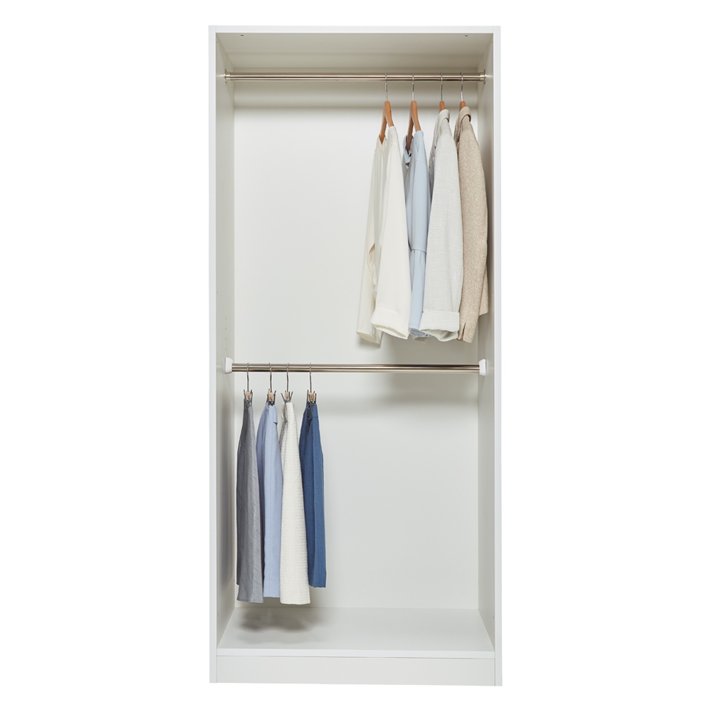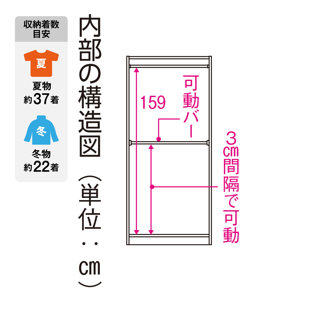 奥行と収納タイプが選べ、ワードローブと間仕切り機能の1台2役の間仕切り収納シリーズ。上置きを設置すれば天井までの大量収納が叶います。左からハンガー2段 幅80cm、棚+引き出し幅60cm、ハンガー1段+引き出し幅60cm(いずれも奥行54cm、ダークブラウン)収納と間仕切りの1台2役!お部屋の用途が広がりますワードローブと間仕切り機能、1台2役の衣類収納シリーズ。空間を仕切りながら、大容量収納まで叶えてくれます。幅・奥行・収納タイプが選べ、上置きを設置すれば天井までのスペースも有効活用。まるで造り付けのような収納空間が完成します。お届け商品 ※右:内部の構造図(単位cm)ハンガー2段タイプ 幅60cm奥行54cm2段のハンガー収納。下段のハンガーバーは、3cm間隔で高さ調節ができ、取り外しも可能です。左から 上下ハンガー2段(幅80cm)、ハンガー+引出し(幅80cm)、棚+引出し(幅60cm)選べる収納タイプ・サイズ使い勝手や収納物に応じて、幅・収納タイプを選び、自由に組み合わせてお使いいただけます。 収納タイプは上下ハンガー2段タイプ、ハンガー+引出しタイプ、棚+引出しタイプの3種類、幅は60cm・80cmの2サイズをご用意。色はホワイト・ナチュラル・ダークブラウンの3色。お部屋のインテリアに合わせてお選びください。 ※お届け商品は「奥行54cm」タイプです奥行スリム&オープンタイプで省スペース扉のないオープンタイプで、開閉スペースが不要な省スペース設計です。 奥行は44cmと54cmの2サイズをご用意。お部屋に合わせてお選びください。奥行44cm:ジャケットの肩は少し出るけれど、十分な収納力。あまりスペースがなく、省スペースで使いたい方におすすめ。 奥行54cm:衣類をすっぽり隠すように収納できるので、お部屋がよりスッキリ見えます。上置き使用例突っ張り式の上置きで収納力UP収納力をUPしながら、本体をしっかりと固定する「突っ張り式上置き(別売)」と組み合わせて使うことができます。上置きはご自宅の天井の高さに応じて、1cm単位でオーダー可能。 上置きとの組合せ次第で、天井高208〜272cmに対応します。 コーディネート例:ホワイト(収納面)お部屋を広く演出するホワイト壁馴染みが良く、大きな家具でも圧迫感が出にくいのが特徴。コーディネート例:ダークブラウン(間仕切り面)高級感のあるダークブラウンまるでウォルナット材のように、落ち着いた印象の木目柄。モダンなスタイルにピッタリのデザイン。 リビングを仕切って、片側をベッドスペースにすることも。コーディネート例:ナチュラル(収納面)柔らかな印象のナチュラル綺麗な木目柄で、北欧風のナチュラル色。インテリアを選ばず、どんなスタイルにも合わせやすいのがポイントです。ふたりで部屋をシェアしながら、収納も確保。