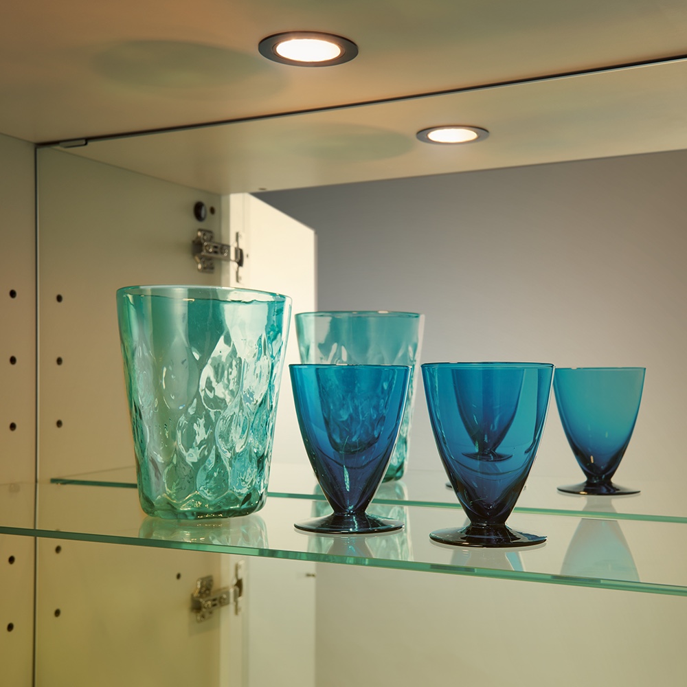 LEDライトで光の演出を。お気に入りを照らすダウンライト付き。背面ミラーで光の反射も美しく。