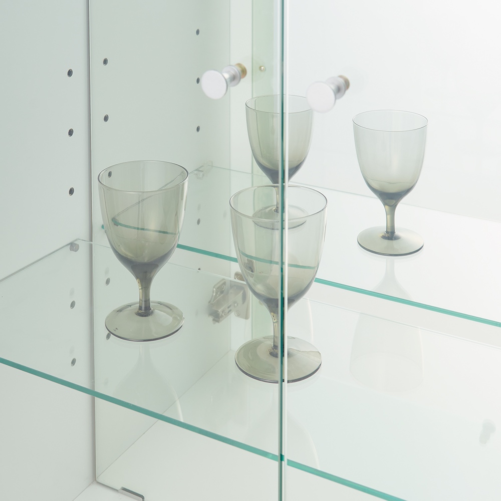 ガラス扉で「見せる」「ほこり対策」を両立 ライトの光が透過し収納部に広がるガラス棚。グラス等を引き立てます。