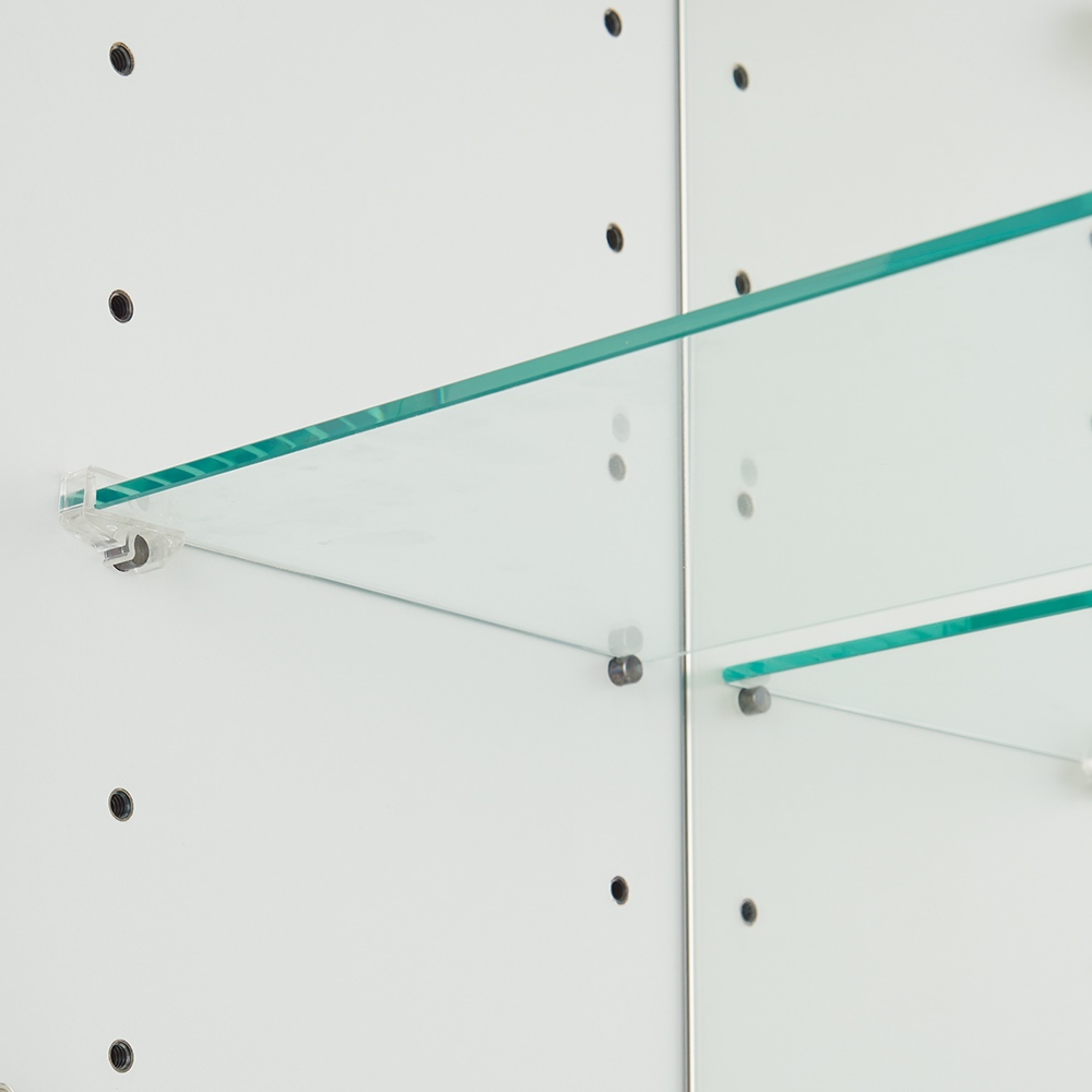 収納するものに合わせて調節できる可動棚。ガラス棚は6cm、板棚は3cmピッチで可動。収納するものの高さに合わせて設置できます。
