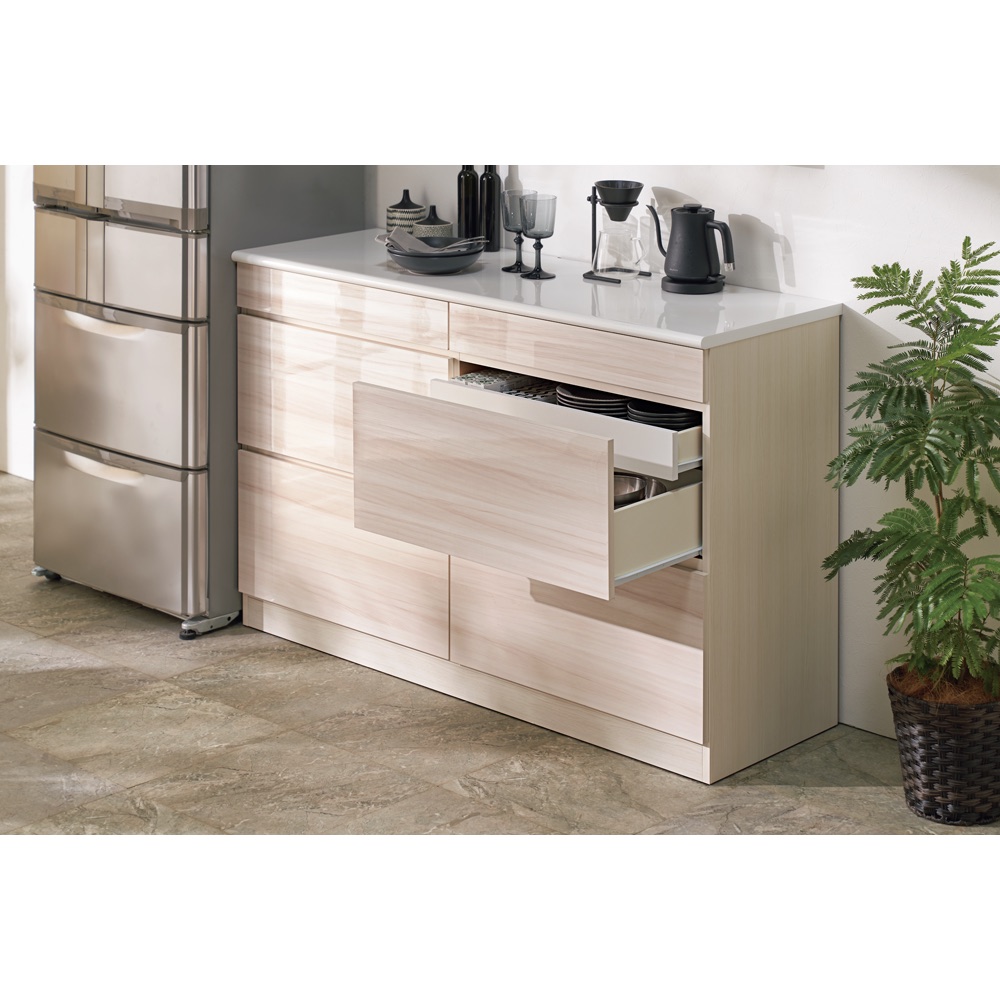 美しい光沢木目が目を引く収納棚は、キッチンをワンランクアップしてくれます。