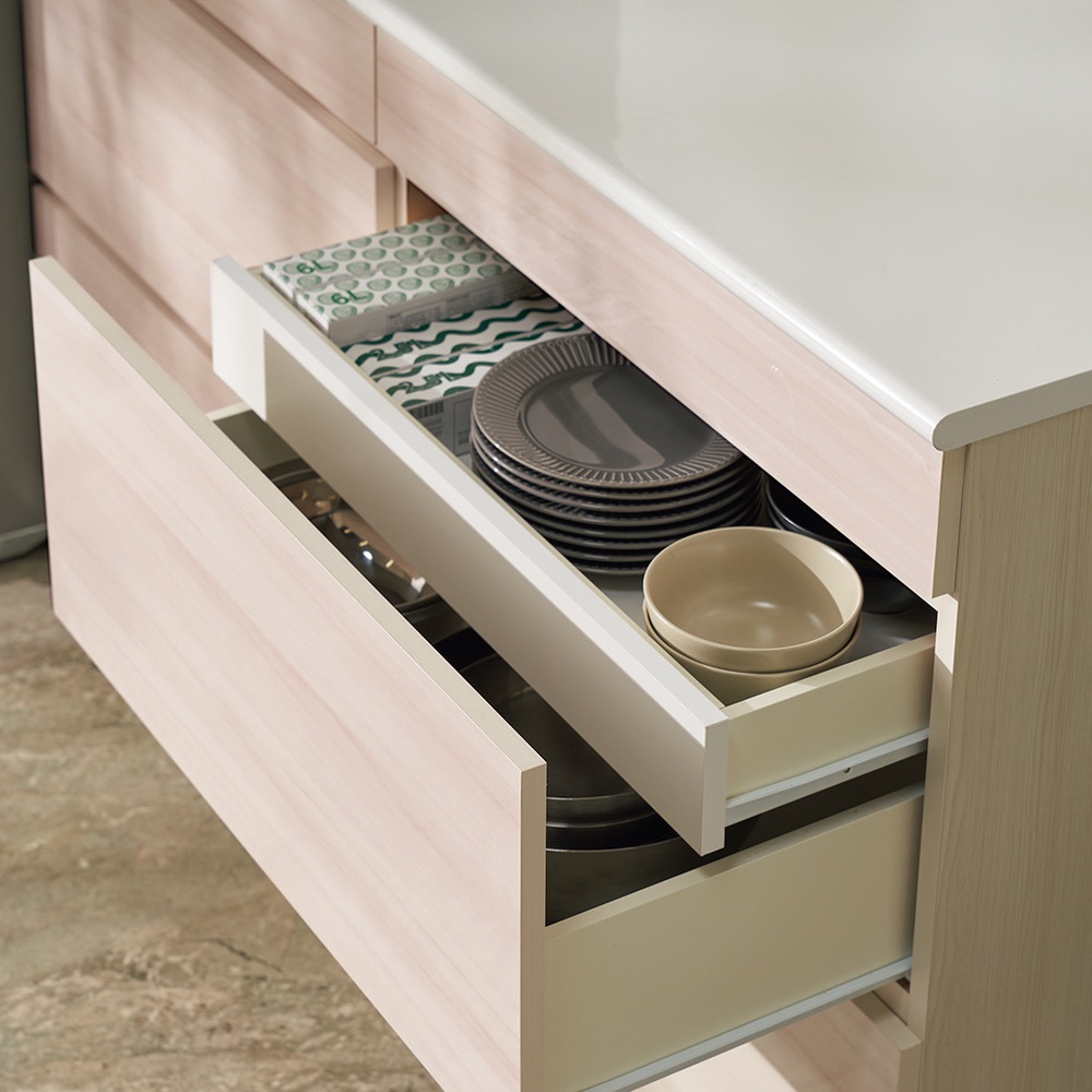 • 2段目:置き場所に困る小皿や平皿の収納に便利なインナー引き出し付き。