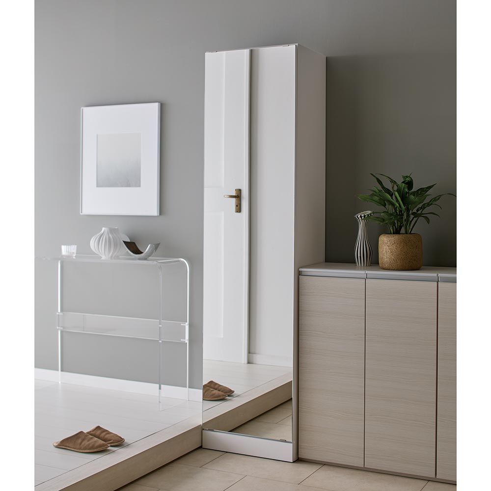 どの靴を合わせようか、全身ミラーでコーディネートチェック。シンプルでミラーとの組み合わせは、合わせやすく圧迫感の少ないデザインになっています。●幅木をよけて壁に設置できます。(7.5×1.5cm)●棚板の色は本体:ホワイト・ナチュラルはホワイト、本体:グレーウォッシュはブラウンです。●コード通し穴があるので、充電器を隠しながら充電することができます。●完成品なのですぐご使用になれます。●日本製