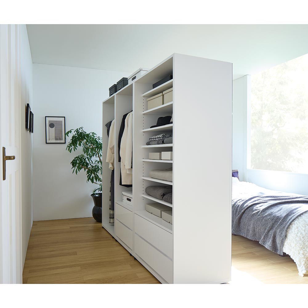空間を間仕切りしながら収納も両立。ベッドルームで使えばウォークインクロゼット感覚のスペースが生まれます。お部屋を仕切れるクローゼット収納●収納面を壁側に向けることで簡易的なウォークインクローゼットが出現●ストッパー付き隠しキャスターがついているので模様替えや掃除も楽にできます●板タイプとミラータイプからお選びいただけます●引き出しはフルスライドレール仕様なので収納物が一目でわかります●引き出し内寸:幅50.5、高さ13.5、奥行47cm●引き出しを最大に出した時の全体奥行は約105cm