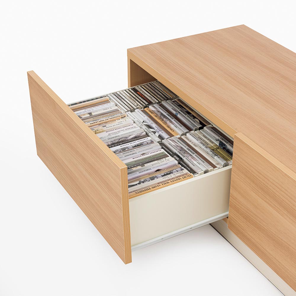 引き出しは開閉がスムーズなスライドレール仕様。ソフト類や周辺機器の収納に便利です。内部は美しい化粧仕上げです。