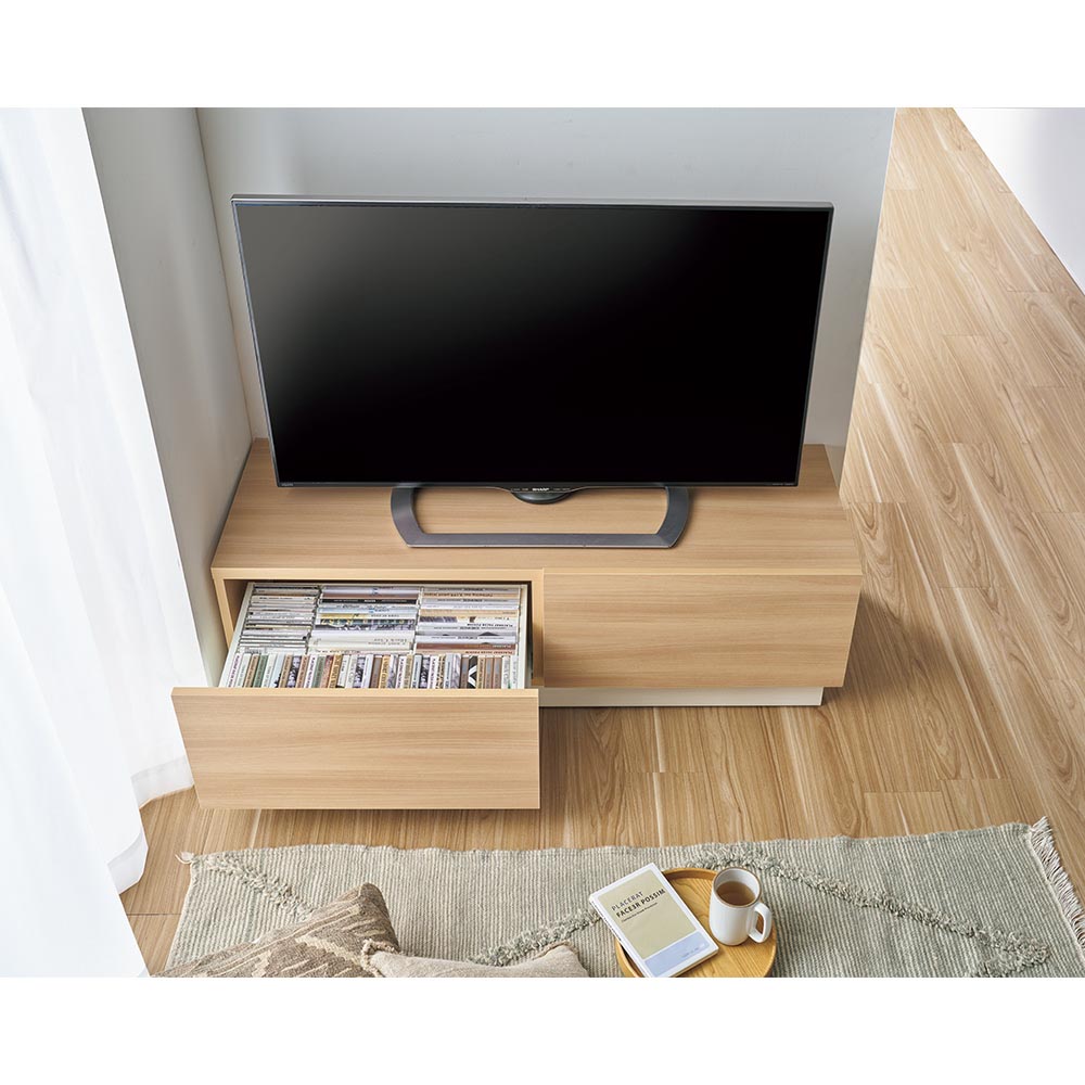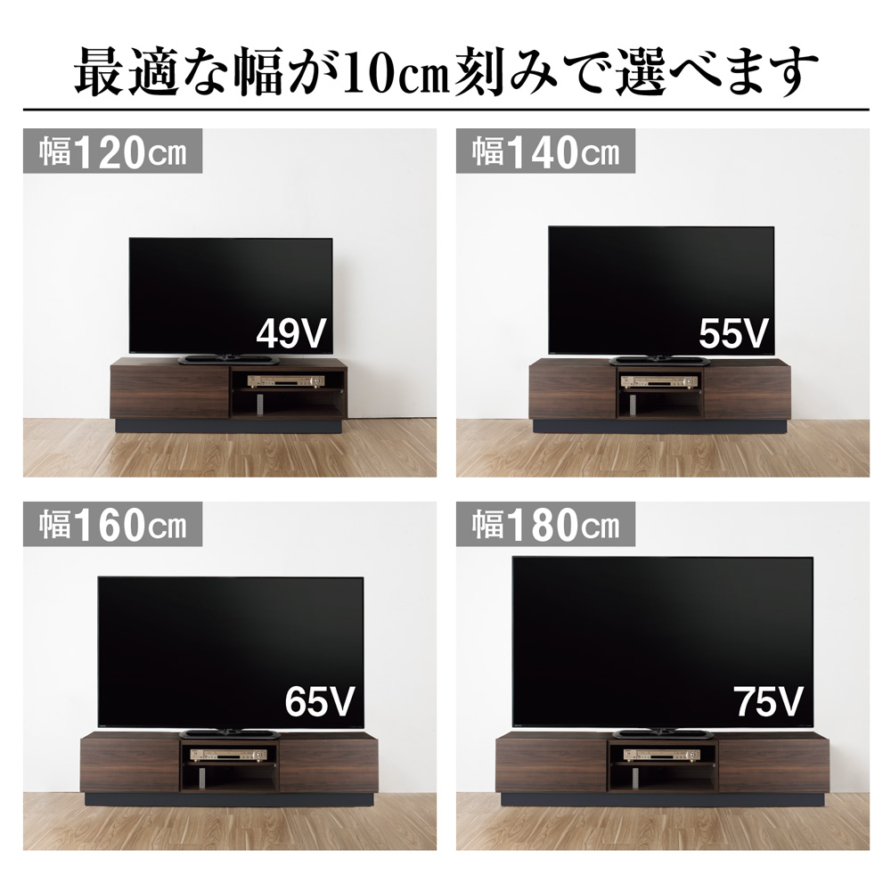 お部屋の広さやテレビサイズに合わせて、10cm刻みで幅が選べるローボード。無駄な空間を作らず、造り付けのような印象に仕上がります。10cm刻みでちょうどいい幅が選べるロータイプのテレビボード●幅110cm〜180cmの範囲で、10cm刻みでサイズオーダーできます。(このページは幅160cmタイプの販売ページです)●柱やドア、窓、他の家具との間など、置きたい場所にぴったり、無駄のない収納スペースを造れます。●大画面テレビやスピーカーが余裕で置ける幅180cmまでご用意。ホームシアターも楽しめます。●コード穴付きの収納スペースは、オープンタイプとフラップ扉タイプが選べます。(このページはオープンタイプの販売ページです)●色は明るい木目調のナチュラルとモダンで上質なダークブラウンの2色をご用意しました。片づけ上手になるための工夫を随所に施しました●引き出しは奥行37cm高さ16.5cmと収納力も十分。ソフト類や周辺機器の収納に便利です。●オープンタイプは可動棚1枚付き。デッキなどのサイズに合わせて高さが変えられます。●フラップ扉タイプはゲーム機やおもちゃなども入れやすく、お子さまの出しっ放しがなくなります。●天板後部には欠き込み付き、オープンタイプの棚後部にはすき間とコード穴があり、スムーズに配線できます。●テレビ周りの機器類、モデムやルーターはもちろん、リビングにはみ出しがちな日用品の収納にも便利です。品質と使いやすさにこだわって、完成品でお届けします●テレビはここに置きたい!というインテリアプランを、10cm単位の幅オーダーでスッキリ叶えます。●テレビボード、リビング収納、ディスプレイスペースなど、多彩な役割を1台でこなします。●お部屋が散らかるストレスから解放されて、ゆったりと落ち着くリビングが完成します。●組み立て不要の完成品でお届けしますので、組み立てが苦手な方もすぐにお使いいただけます。●国内でひとつひとつ丁寧に仕上げた日本製。安心して長くお使いいただけます。シリーズ商品のご案内幅10cm刻みで設置場所にぴったり!幅が選べるテレビ台は以下のシリーズ商品がございます。・オープンタイプ 幅110cm〜180cm(10cm単位でサイズオーダー)奥行45cm高さ37cm・フラップ扉タイプ 幅110cm〜180cm(10cm単位でサイズオーダー)奥行45cm高さ37cm