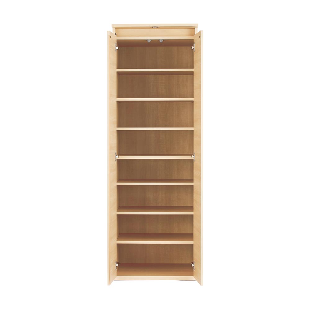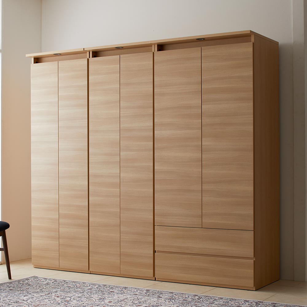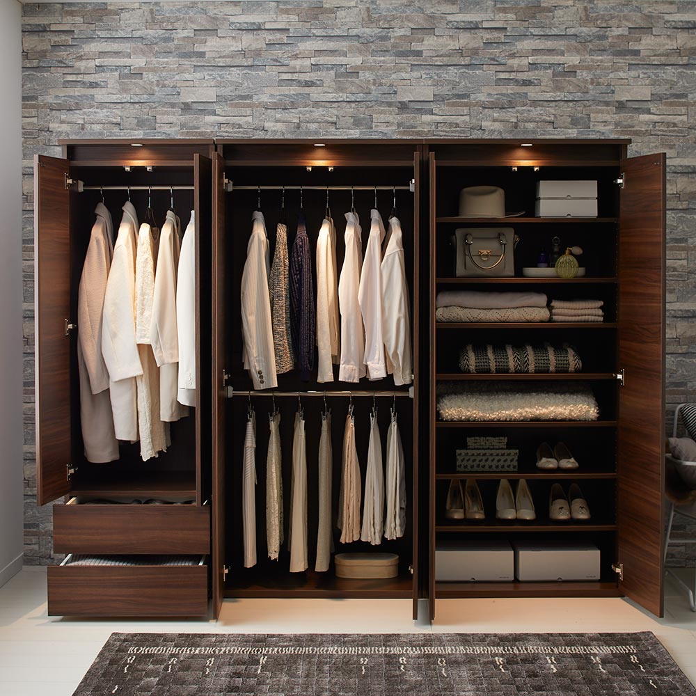落ち着いた雰囲気をたたえた天然木調の木目がLEDライトに映えて、お部屋に成熟した華やぎを放ちます。輝くLEDライトがお部屋の演出にも一役天板に備えたLEDのダウンライトが、端正な木目の前扉を幻想的に照らします。LEDのダウンライトが、間接照明のようにふんわりと光の陰影を演出。暗くなりがちな衣裳部屋を明るく照らし、コーディネートの際にも便利。点灯スイッチでLEDライトをON/OFFできます。お好みで組み合わせができる2段クローゼットハンガー・ブレザータイプ・棚(収納庫)・チェストの多彩なラインナップから選べるロッカータンスシリーズ。組み合わせ次第で、壁一面に大容量のクローゼット収納が完成します。並べて設置すれば、見た目も造りつけのような美しさに。お出かけ前の必需品が整理整頓できれば、時短にもつながります。お手入れがしやすく、インテリアに馴染む表面材を使用前板にはキズに強く、汚れてもお手入れが楽な素材を使用しています。表面材の仕様は、リビングや寝室・衣裳部屋などを格調高く演出する木目調仕上げ。安心と信頼の職人技が光る国産の収納家具熟練の家具職人がひとつずつ丁寧に仕上げたワンランク上の日本製ワードローブです。細部の丁寧な仕上がりなど日本製の高品質な衣類収納ハンガーで快適な暮らしを。