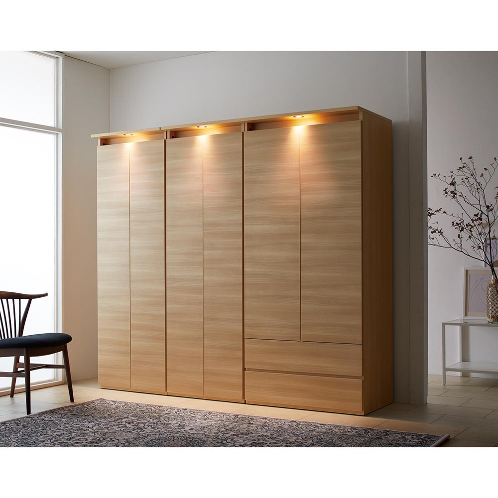 落ち着いた雰囲気をたたえた天然木調の木目がLEDライトに映えて、お部屋に成熟した華やぎを放ちます。輝くLEDライトがお部屋の演出にも一役天板に備えたLEDのダウンライトが、端正な木目の前扉を幻想的に照らします。LEDのダウンライトが、間接照明のようにふんわりと光の陰影を演出。暗くなりがちな衣裳部屋を明るく照らし、コーディネートの際にも便利。点灯スイッチでLEDライトをON/OFFできます。お好みで組み合わせができる2段クローゼットハンガー・ブレザータイプ・棚(収納庫)・チェストの多彩なラインナップから選べるロッカータンスシリーズ。組み合わせ次第で、壁一面に大容量のクローゼット収納が完成します。並べて設置すれば、見た目も造りつけのような美しさに。お出かけ前の必需品が整理整頓できれば、時短にもつながります。お手入れがしやすく、インテリアに馴染む表面材を使用前板にはキズに強く、汚れてもお手入れが楽な素材を使用しています。表面材の仕様は、リビングや寝室・衣裳部屋などを格調高く演出する木目調仕上げ。安心と信頼の職人技が光る国産の収納家具熟練の家具職人がひとつずつ丁寧に仕上げたワンランク上の日本製ワードローブです。細部の丁寧な仕上がりなど日本製の高品質な衣類収納ハンガーで快適な暮らしを。