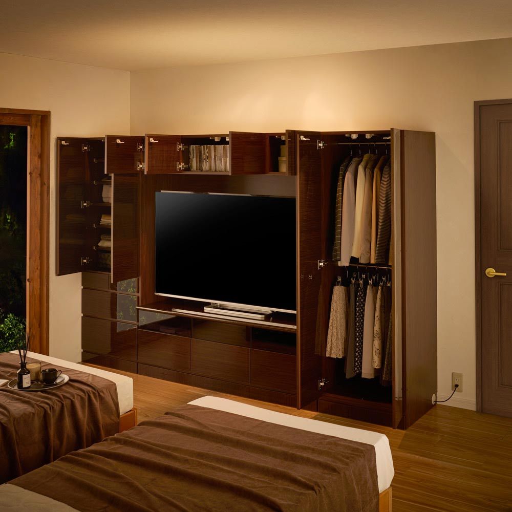 使用イメージ(イ)ダークブラウン 光沢が美しいフラット扉で、お部屋とスマートに一体化。 ※写真左から棚チェストタイプ幅60cm、テレビ台幅155cm、ハンガータイプ幅60cmの組み合わせです。(天井高さ240cm)(テレビサイズ65V)