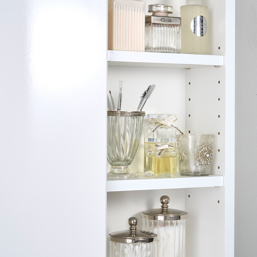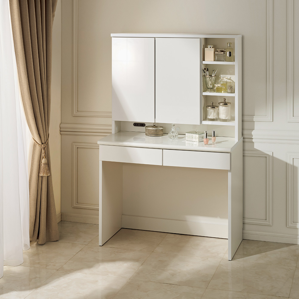 使用イメージ(ア)光沢ホワイト ミラーを閉じれば高級感のあるデスクに。手芸などの趣味や家事のスペースとしても。 ※写真は別売りの幅89.5cm奥45cmタイプです。