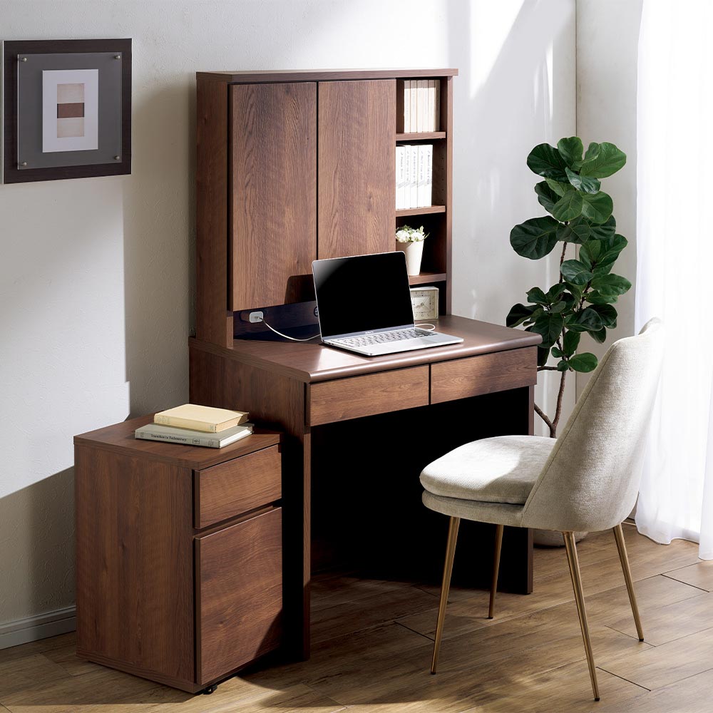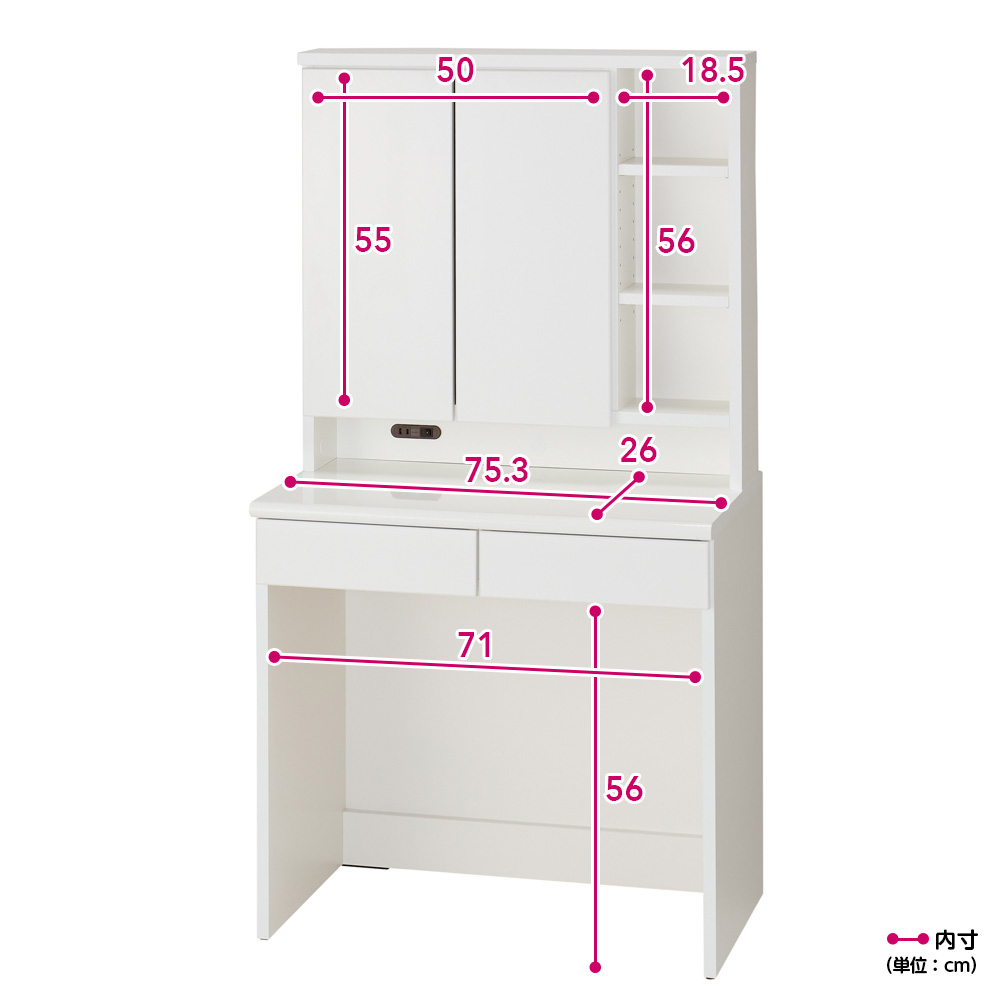 顔を明るく照らすLEDライトをはじめ、メイクアップのための機能を備えながら、扉を閉じればシンプルなデスクに変身。仕事も美容も手を抜かない人のための、ドレッサー兼用デスクです。光沢ホワイト 幅89.5cm奥行45cmタイプメイクもワークも一カ所で。私を磨くリッチなデスク顔を明るく照らすLEDライトをはじめ、メイクアップのための機能を備えながら、扉を閉じればシンプルなデスクに変身。仕事も美容も手を抜かない人のために、美しさと使いやすさを叶えました。光沢ホワイト 幅89.5cm奥行45cmタイプ使わないときは鏡を隠せるので、置き場所を選びません使わないときは扉を閉じてミラーとLEDライトを隠せる2WAY設計。リビングなどに置いても違和感がなく、なんとなく落ち着かない、仕事に集中できないといったこともありません。ダークブラウン 幅75.5cm奥行56cm ※ワゴンは別売りです。デスクワークやPC作業のしやすさにも配慮扉を閉じればリモートワークや在宅作業に最適なデスクに。フラットな天板はラップトップPCが使いやすいサイズ。別売りのワゴンにはB5サイズの書類も収納でき、必要な時だけ仕事道具をサッと広げて快適に作業ができます。光沢ホワイト幅75.5cm奥行45cmタイプ ダークブラウン幅89.5cm奥行56cm ※ワゴンは別売りです。扉を開ければゴージャスなメイクスペースが出現扉を閉じればシンプルなデスクに変身。リビングなどに置いても違和感がなく、スペースにゆとりがないという方にもオススメです。扉を開ければ両側から顔を明るく照らしてメイクがしやすいLEDライト、コスメや美容グッズがスッキリ片付く収納、高級感のある素材使いなど、ゴージャスな気分でキレイになれるドレッサーです。組立不要・日本製ドレッサー兼用デスクシリーズ商品は、幅75.5cm奥行45cm、幅89.5cm奥行45cm、幅75.5cm奥行56cm、幅89.5cm奥行56cmの4タイプ。色は光沢ホワイトとダークブラウンの2色展開で、お部屋に合わせてお選びいただけます。国内メーカーが丁寧に仕上げて完成品でお届けしますので、届いたらすぐお使いいただけます。両サイドから顔を明るく照らしてメイク上手に左右にLEDライトを設置した女優ミラー仕様。ゴージャスな雰囲気を味わえるだけでなく、顔に影ができにくいので繊細な作業がしやすく、メイクの腕がアップします。美容家電に使えるコンセントと付け替え可能なLEDライト付き(写真左)顔を明るく照らしてくれるLEDライトは交換可能。(写真右)美容家電の使用時に便利な1口コンセント付き。化粧品のボトルやコスメグッズは可動棚に収納化粧水のボトルやコスメ類などを飾るように収納できるオープンシェルフ。可動棚(3cm間隔)なので、収納物に合わせて高さを変えられます。細々した物がたくさん収納できる引き出し付き天板下には引き出し2杯付き。リップ、シャドウ、チークなど、小型のコスメや美容グッズ、デスク使用時に必要な文具類がたっぷり収納できます。