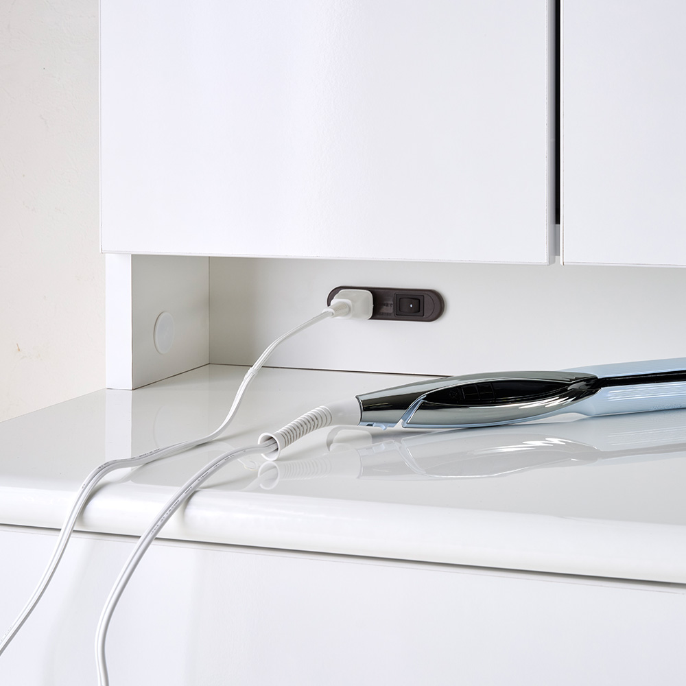 コンセント付きで、ドライヤーやヘアアイロンなどの美容家電、充電器などデスクワーク機器の使用に便利です。