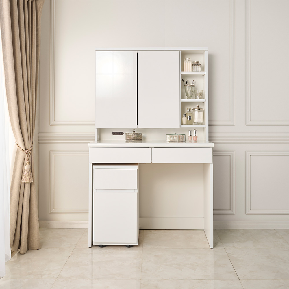(ア)光沢ホワイト メイクスペースとワークスペースを一体化。広さにゆとりのないお部屋でも1台2役に活躍します。