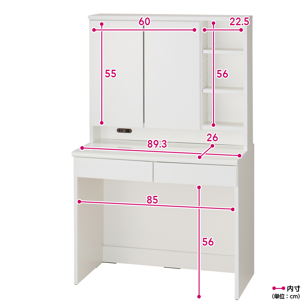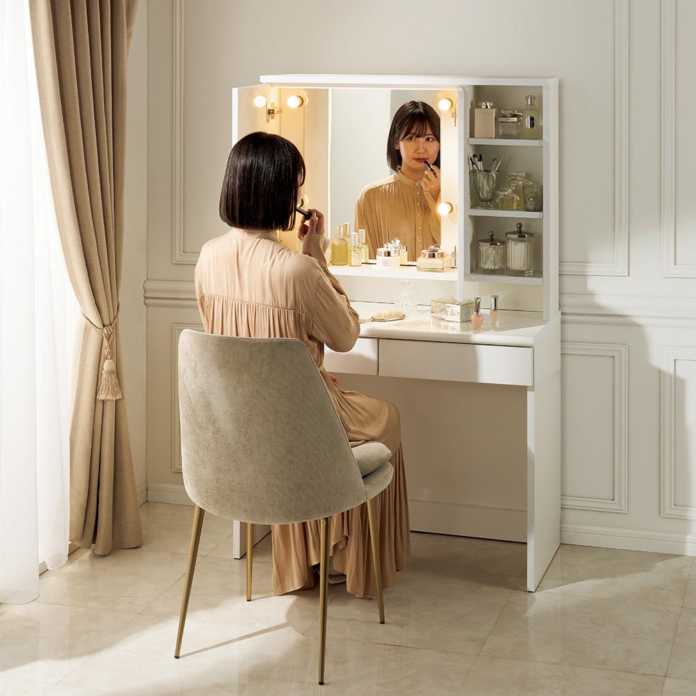顔を明るく照らすLEDライトをはじめ、メイクアップのための機能を備えながら、扉を閉じればシンプルなデスクに変身。仕事も美容も手を抜かない人のための、ドレッサー兼用デスクです。光沢ホワイト 幅89.5cm奥行45cmタイプメイクもワークも一カ所で。私を磨くリッチなデスク顔を明るく照らすLEDライトをはじめ、メイクアップのための機能を備えながら、扉を閉じればシンプルなデスクに変身。仕事も美容も手を抜かない人のために、美しさと使いやすさを叶えました。光沢ホワイト 幅89.5cm奥行45cmタイプ使わないときは鏡を隠せるので、置き場所を選びません使わないときは扉を閉じてミラーとLEDライトを隠せる2WAY設計。リビングなどに置いても違和感がなく、なんとなく落ち着かない、仕事に集中できないといったこともありません。ダークブラウン 幅75.5cm奥行56cm ※ワゴンは別売りです。デスクワークやPC作業のしやすさにも配慮扉を閉じればリモートワークや在宅作業に最適なデスクに。フラットな天板はラップトップPCが使いやすいサイズ。別売りのワゴンにはB5サイズの書類も収納でき、必要な時だけ仕事道具をサッと広げて快適に作業ができます。光沢ホワイト幅75.5cm奥行45cmタイプ ダークブラウン幅89.5cm奥行56cm ※ワゴンは別売りです。扉を開ければゴージャスなメイクスペースが出現扉を閉じればシンプルなデスクに変身。リビングなどに置いても違和感がなく、スペースにゆとりがないという方にもオススメです。扉を開ければ両側から顔を明るく照らしてメイクがしやすいLEDライト、コスメや美容グッズがスッキリ片付く収納、高級感のある素材使いなど、ゴージャスな気分でキレイになれるドレッサーです。組立不要・日本製ドレッサー兼用デスクシリーズ商品は、幅75.5cm奥行45cm、幅89.5cm奥行45cm、幅75.5cm奥行56cm、幅89.5cm奥行56cmの4タイプ。色は光沢ホワイトとダークブラウンの2色展開で、お部屋に合わせてお選びいただけます。国内メーカーが丁寧に仕上げて完成品でお届けしますので、届いたらすぐお使いいただけます。両サイドから顔を明るく照らしてメイク上手に左右にLEDライトを設置した女優ミラー仕様。ゴージャスな雰囲気を味わえるだけでなく、顔に影ができにくいので繊細な作業がしやすく、メイクの腕がアップします。美容家電に使えるコンセントと付け替え可能なLEDライト付き(写真左)顔を明るく照らしてくれるLEDライトは交換可能。(写真右)美容家電の使用時に便利な1口コンセント付き。化粧品のボトルやコスメグッズは可動棚に収納化粧水のボトルやコスメ類などを飾るように収納できるオープンシェルフ。可動棚(3cm間隔)なので、収納物に合わせて高さを変えられます。細々した物がたくさん収納できる引き出し付き天板下には引き出し2杯付き。リップ、シャドウ、チークなど、小型のコスメや美容グッズ、デスク使用時に必要な文具類がたっぷり収納できます。