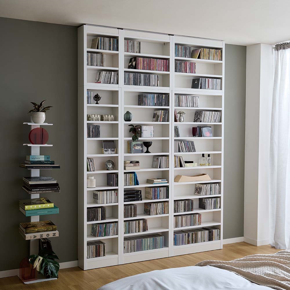 上置きを使用してコレクションした大量のCDを、床から天井までずらりと壁一面へ。まるでショップのような眺めは圧巻です。壁一面をCD収納ライブラリーにできるCDライブラリーの上置きです。本体(別売り)と上置きを設置することにより壁一面をCD収納ライブラリーに変貌できます。高さ78cmタイプは天井高さ260cmに対応。CD収納枚数は120枚になります。※CDケースのサイズは幅14.2×高さ12.5×厚さ1.1cmで計算