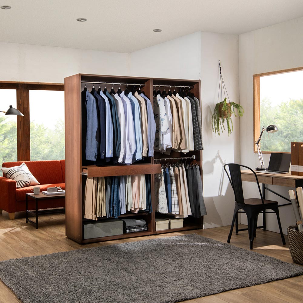 使用イメージ(エ)ウォルナット レイアウトを簡単に変えられる「動く収納」だから、多様な生活スタイルにジャストフィット。 ※写真左から「ハンガー&パンツハンガータイプ幅89.5cm」「ハンガー2段タイプ幅70.5cm」です
