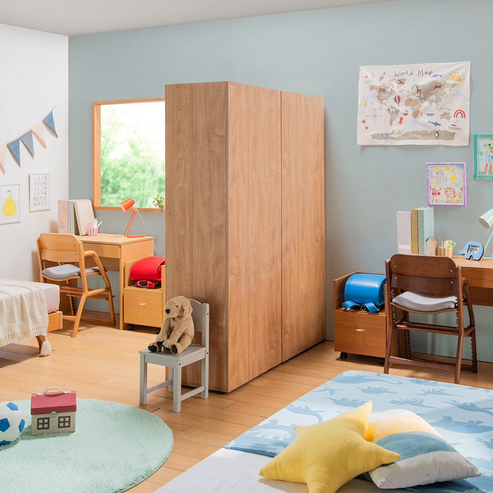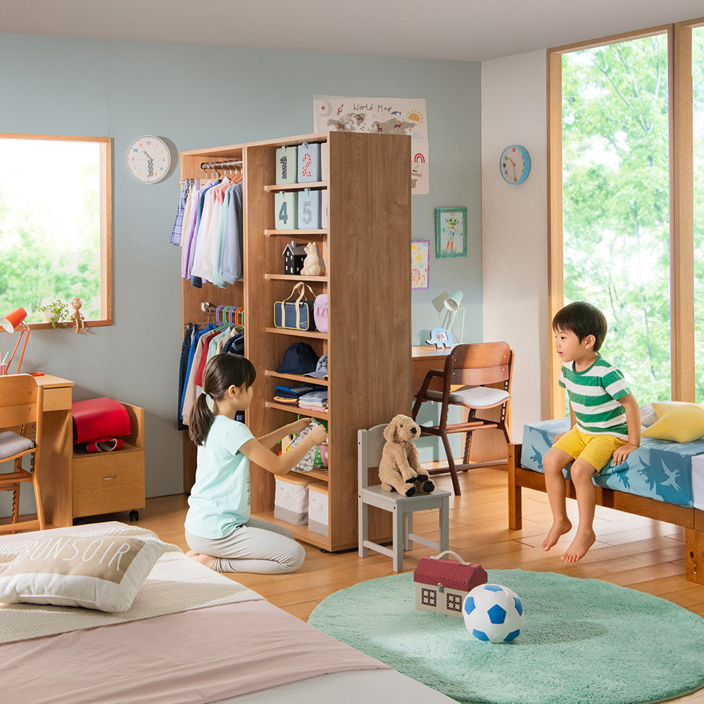 コーディネート例(ウ)ナチュラルオーク 子供部屋のゆるやかな間仕切りとして、勉強に集中できる空間を。お片付けの習慣も楽しく身につきます。 ※写真左から「ハンガー2段タイプ幅70.5cm」「棚7段タイプ幅70.5cm」です