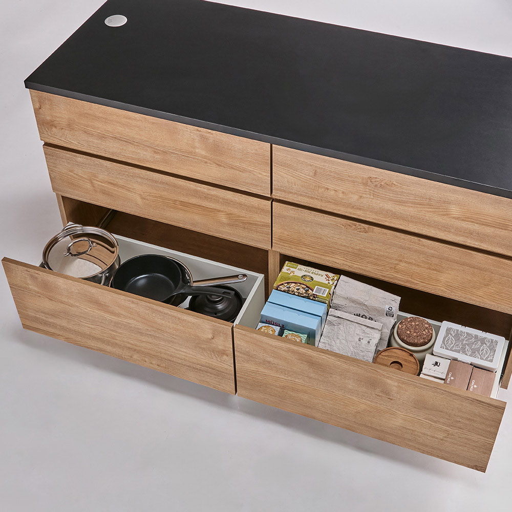 顔が見えると会話が弾む。憧れのアイランドキッチンが置くだけで完成します。食事の支度や片付け中も家族と向かい合っていられるから、みんなが楽しいキッチンに。使い勝手のよい幅120cmで、両面に棚や引き出しがたっぷり。身長に合わせて選べるよう、高さも5サイズをご用意しました。より安定感をお求めの方におすすめの据え置きタイプです。※大型商品につき、搬入経路(入口・階段・廊下等)のご確認をお願いします。壁向き I 型キッチンのご家庭でも、これを置くだけでアイランドキッチンに早変わり(ア)ホワイト ※写真は別売りの幅150cm高さ100cm元からある壁際のシンクやコンロを活かしたまま、憧れのアイランドキッチンを実現するカウンター。大がかりな工事や組立不要で、手軽に夢が叶います。会話が弾むダイニングで、食事の支度も楽しい時間に(イ)ナチュラル ※写真は別売りのキャスター付き幅120cm高さ90cm作業中も家族と向かい合えるから、みんなで同じ時間を共有できて会話が弾みます。お子さまのいるご家庭も、見守れて安心。より安定感をお求めの方には、据え置きタイプがおすすめ(ウ)オーク/ブラック ※写真は高さ95cm最下段の引き出しも使いやすい高さに設定され、キッチンマットを敷いても開閉を妨げません。タイプの違う両面収納で、ダイニングがすっきり(ウ)オーク/ブラック ※写真は高さ95cm片側が引き出し、反対側がオープン収納の両面仕様で、キッチン側、ダイニング側の両方に収納場所を増やせます。調理器具や食器、A4ファイルなどもすっきりたっぷりしまえて、出し入れも簡単です。天板はゆとりある奥行60cm。お手入れも簡単です(ウ)オーク/ブラック 広々とした天板は水や汚れ、傷に強いメラミン素材。作業をするにも安心で、配膳や片付けなど、お子さまも楽しくお手伝いできます。汚れがさっと拭けて、お手入れ簡単です。オープン収納側も引き出し側も、使いやすく工夫(ウ)オーク/ブラック ●オープン部の棚板は3cm間隔で高さ調節可能。奥行約26cmで市販の収納ボックスやカゴもぴったり。●引き出しにはカトラリーからお鍋やフライパン、食器まで収まり、食器棚としても活躍。●引き出しは全段フルスライドレール付きで、奥の物も出し入れスムーズ。据え置きタイプは足元すっきり、幅木にも対応(ウ)オーク/ブラック 幅木を避けて、壁ぴったりに設置できます。身長に合わせて選べる高さ5サイズ×3カラー上:(イ)ナチュラル(別売りのキャスター付き・幅120cm高さ90cmタイプ) 中: (ウ)オーク/ブラック (幅120cm高さ95cmタイプ) 下:(ア)ホワイト(別売りの幅150cm高さ100cmタイプ)高さは80cm・85cm・90cm・95cm・100cmの5サイズをご用意。80cm・85cm・90cmは引き出し3段、95cm・100cmは引き出し4段となります。天板と側面下部のそれぞれ左右にコード穴があり、調理家電の配線にも便利です。開発の想い作業中は一人でポツンとしてしまう I 型キッチン。高額なリフォームなしで、会話が弾み笑顔があふれるアイランドキッチンを実現できれば…。そんな想いで開発しました。作業スペースや収納が足りないお悩みも解決できるので、ぜひお役立てください。